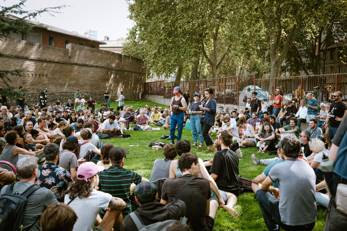 Assemblée générale et affiches collées dans la rue la veille du vote de confiance au gouvernement Bayrou et quelques jours avant les grèves et manifestations prévue le 10 septembre sous le mot d'ordre Bloquons Tout à Toulouse, sud-ouest de la France le 7 septembre 2025.