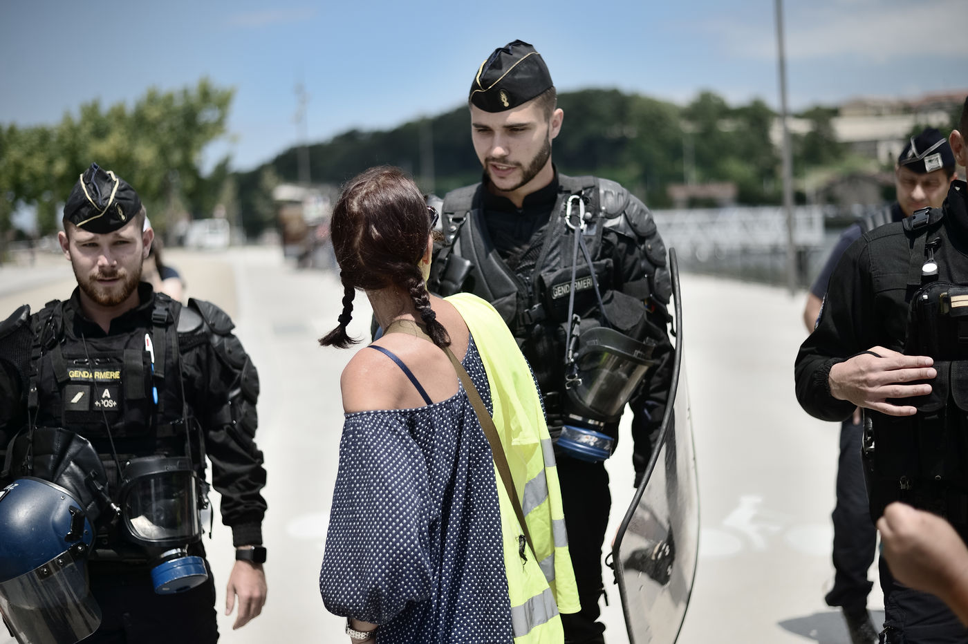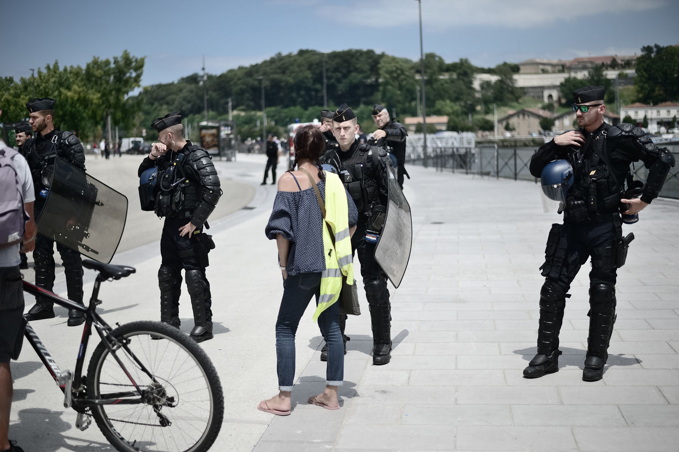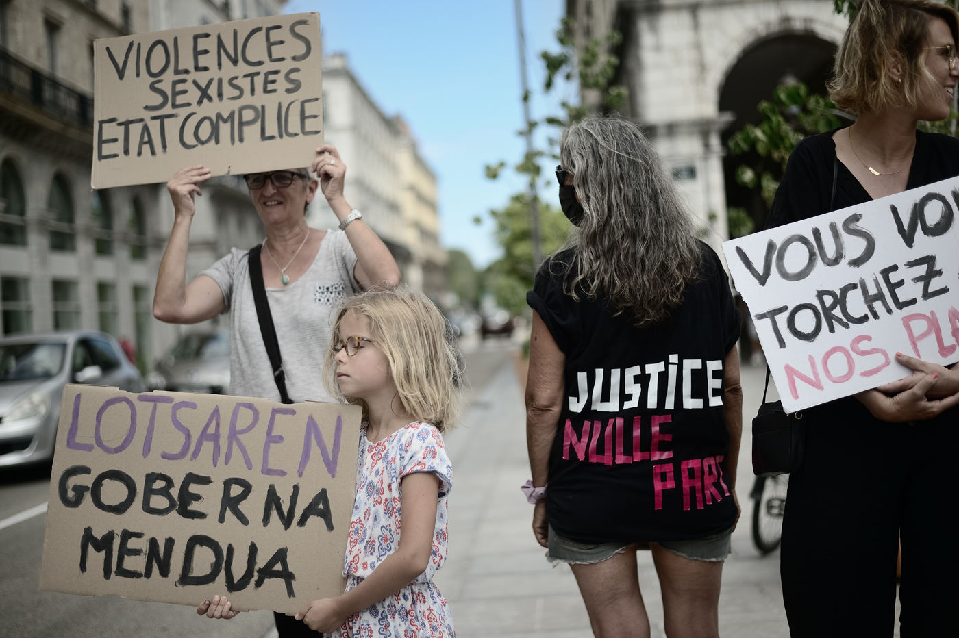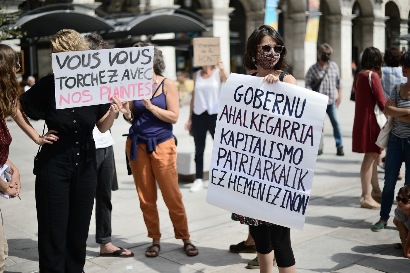 People protest in front of Bayonne town hall for the visit of Gerald Darmanin.