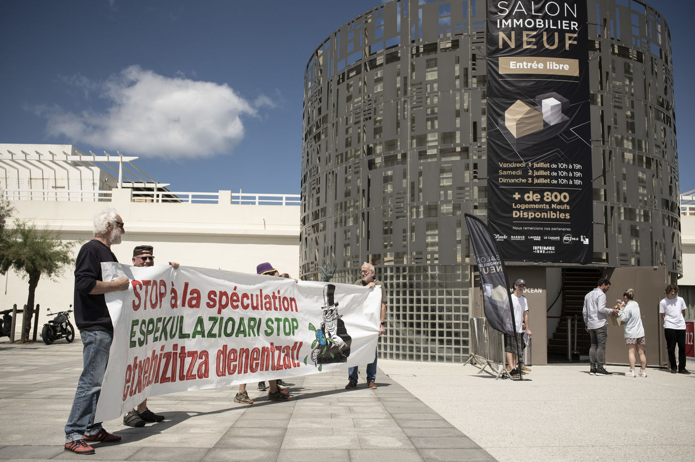 In Anglet, from July 1 to 3, the real estate tradeshow is held. On the first day of the event, the OSTIA collective was present at the entrance and then inside the show to explain the reasons for their anger.