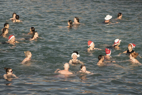 Noël 2022 à Biarritz. Le traditionnel bain de Noël du club des Ours Blancs sur la plage du Port Vieux.