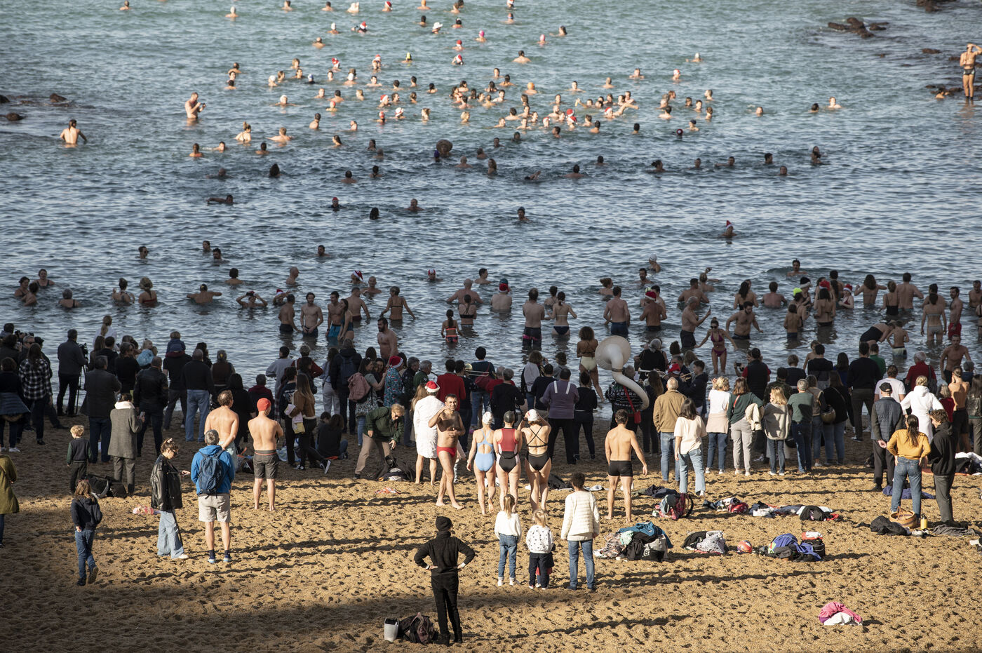 Christmas 2022 in Biarritz. The traditional Christmas bath of the White Bear Club on the beach of Port Vieux.