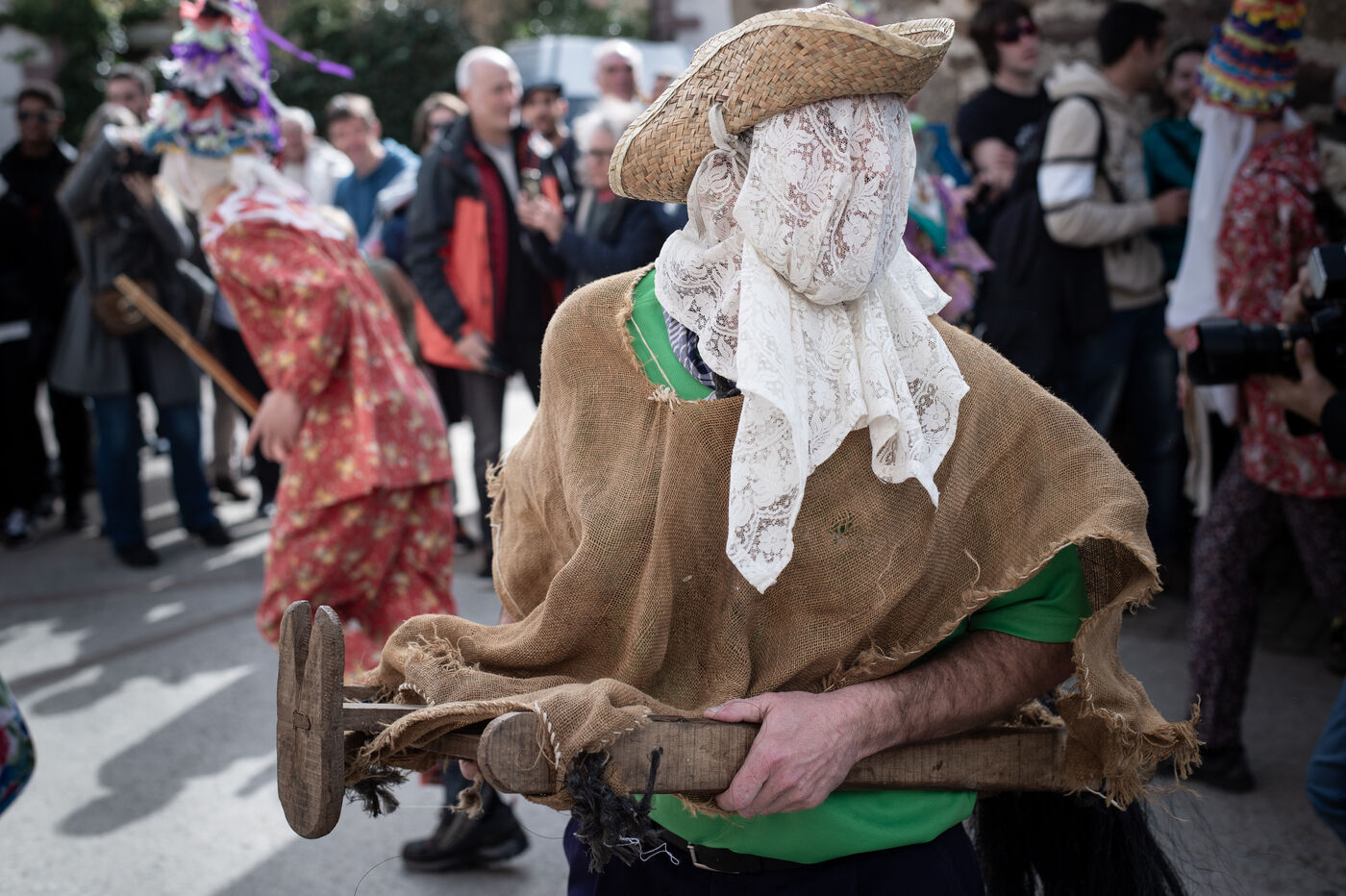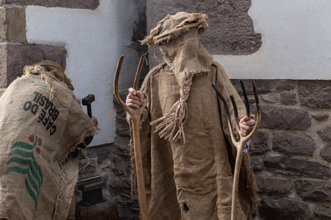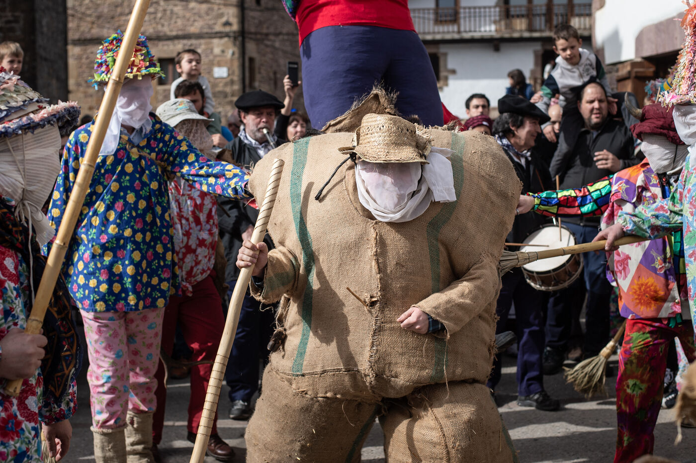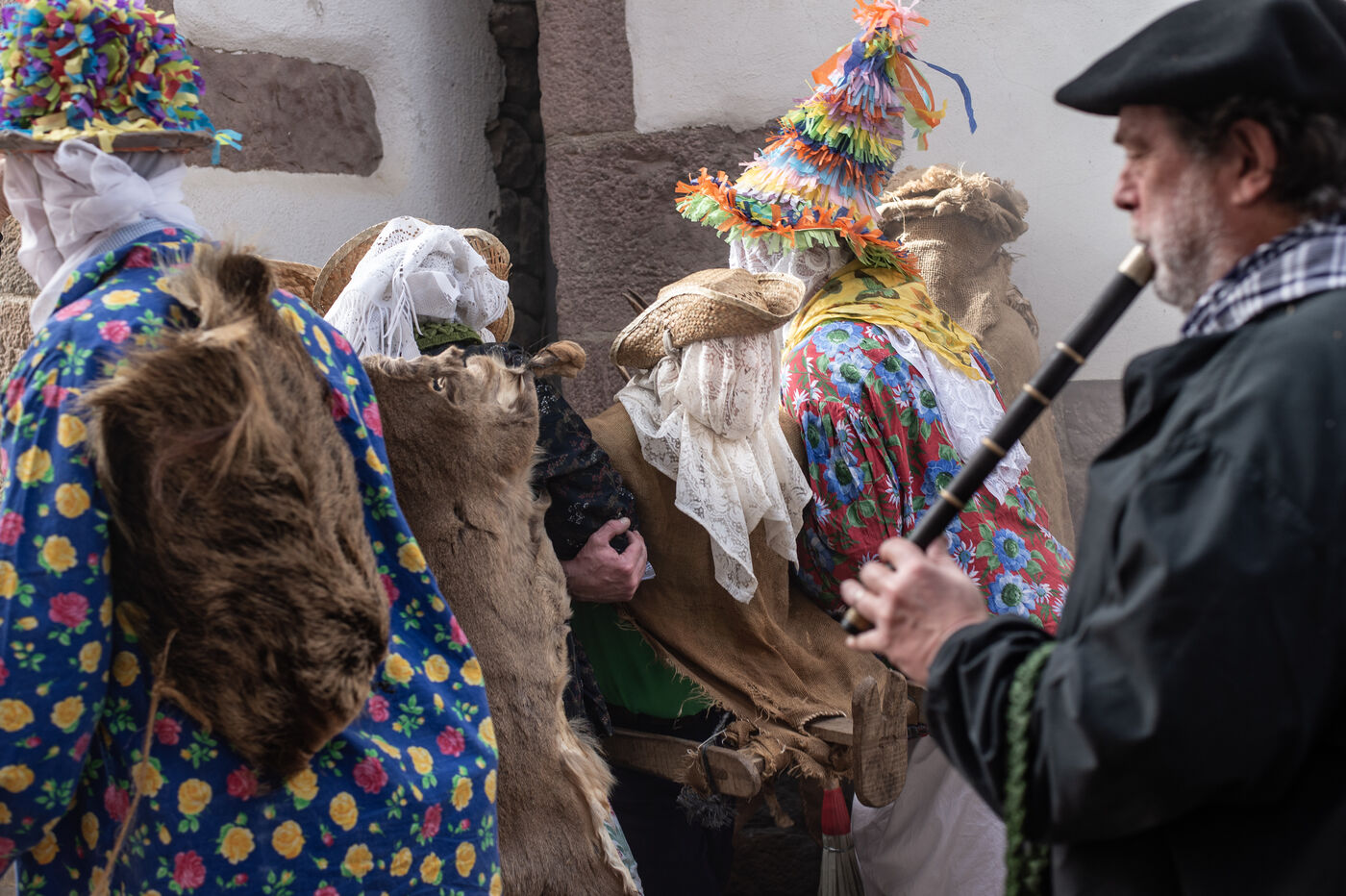 The carnival procession opens with the Perratzaileak, the farriers, who have to shoe Zaldiko, the horseman. Zaldiko emerges in the midst of the Txatxoak, masked and colourful creatures armed with broomsticks. The obese Ziripot is attacked by the Zaldiko, who knocks him over several times. Miel Otxin, a giant with arms in a cross, closes the procession. He is paraded through the streets of the village until his cremation on the evening of Mardi-Gras.