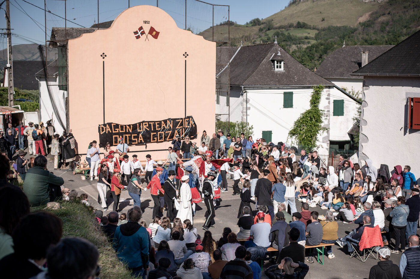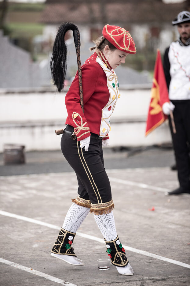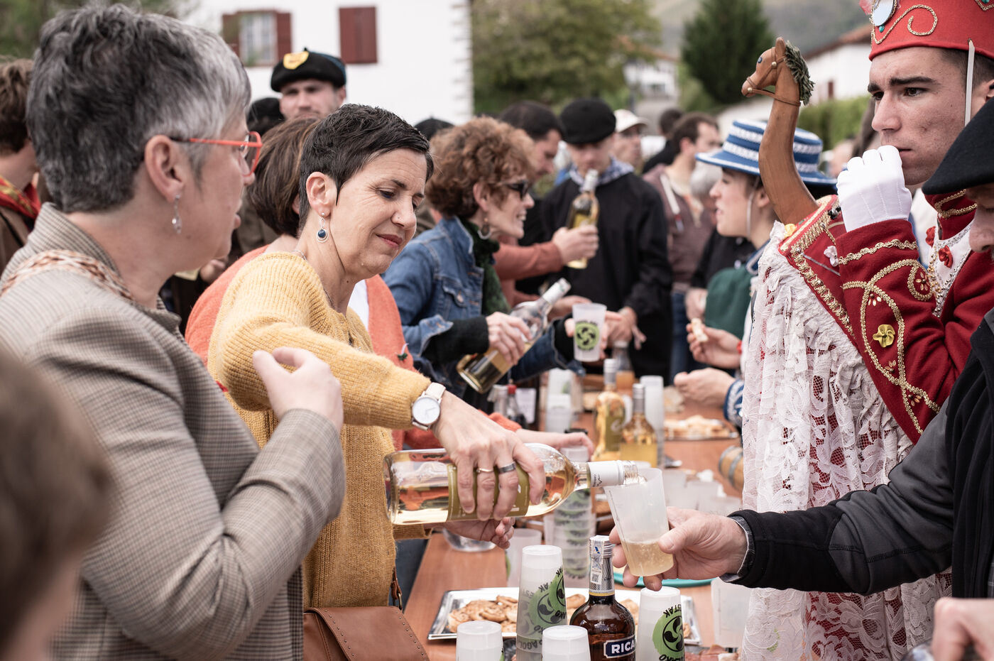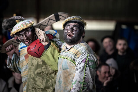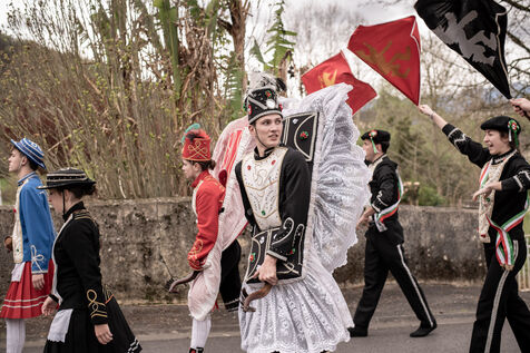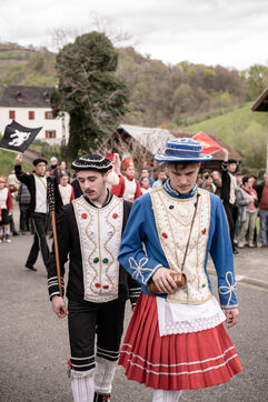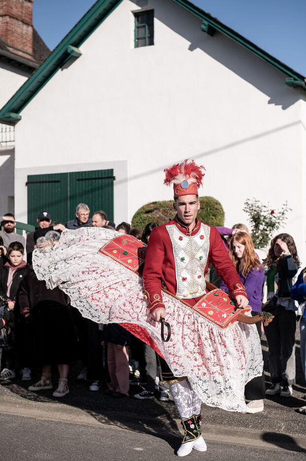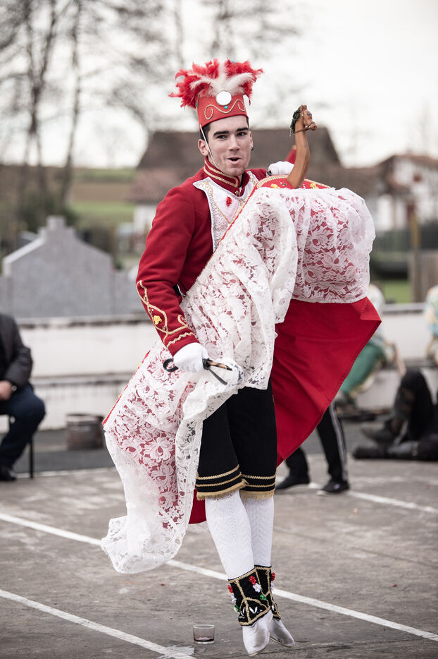 In the afternoon, usually on the fronton of the village, the Maskarada from Pagolle gives a popular theatrical performance combining dance, skits and song. The characters are divided into two groups. On the one hand, the "reds", elegant dancers, with the characters of Entseinari, Zamalzain, Gatuzain, Txerrero.... On the other, the « blacks » with the Buahame, Hartza and Kautere led by their chief Kabana and the facetious Pitxu.