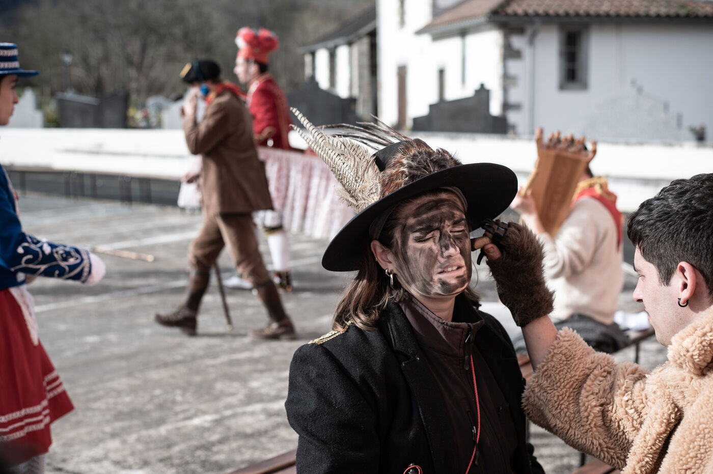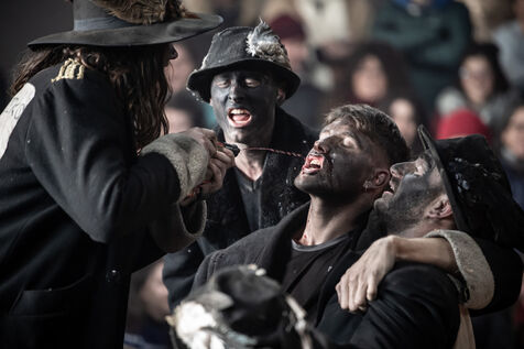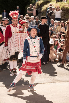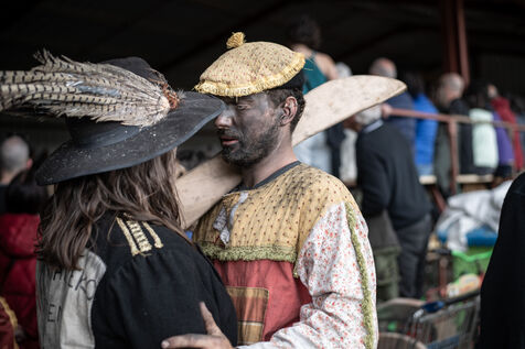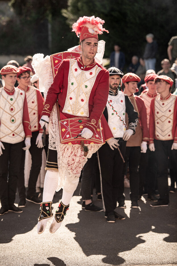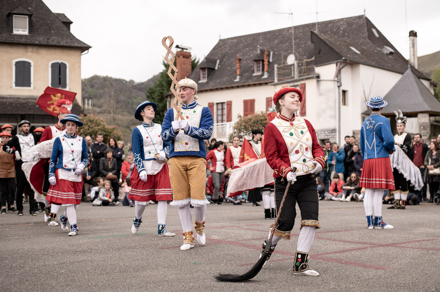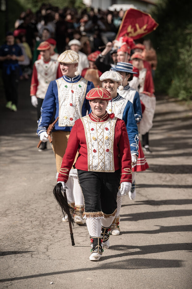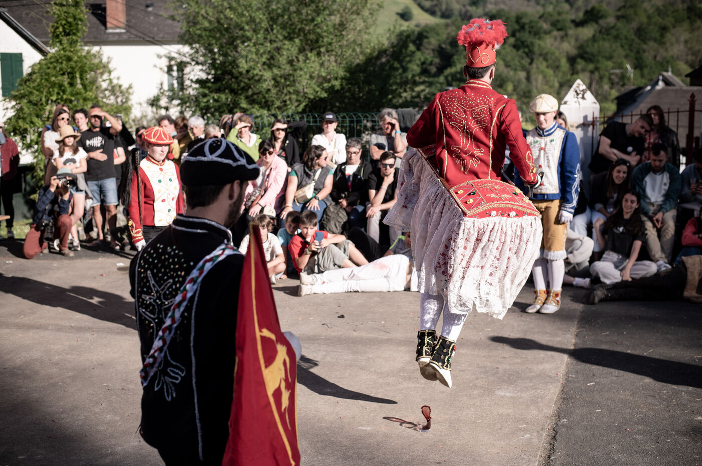 In the afternoon, usually on the fronton of the village, the Maskarada from Pagolle gives a popular theatrical performance combining dance, skits and song. The characters are divided into two groups. On the one hand, the "reds", elegant dancers, with the characters of Entseinari, Zamalzain, Gatuzain, Txerrero.... On the other, the « blacks » with the Buahame, Hartza and Kautere led by their chief Kabana and the facetious Pitxu.