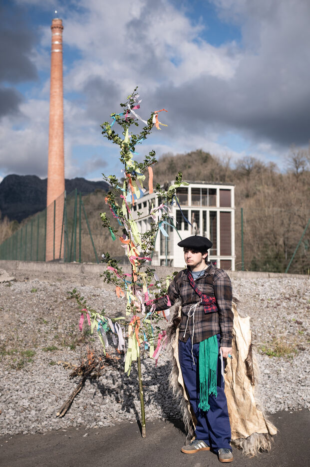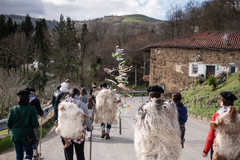 The group carries the spring tree wrapped in ribbons to announce the new year.