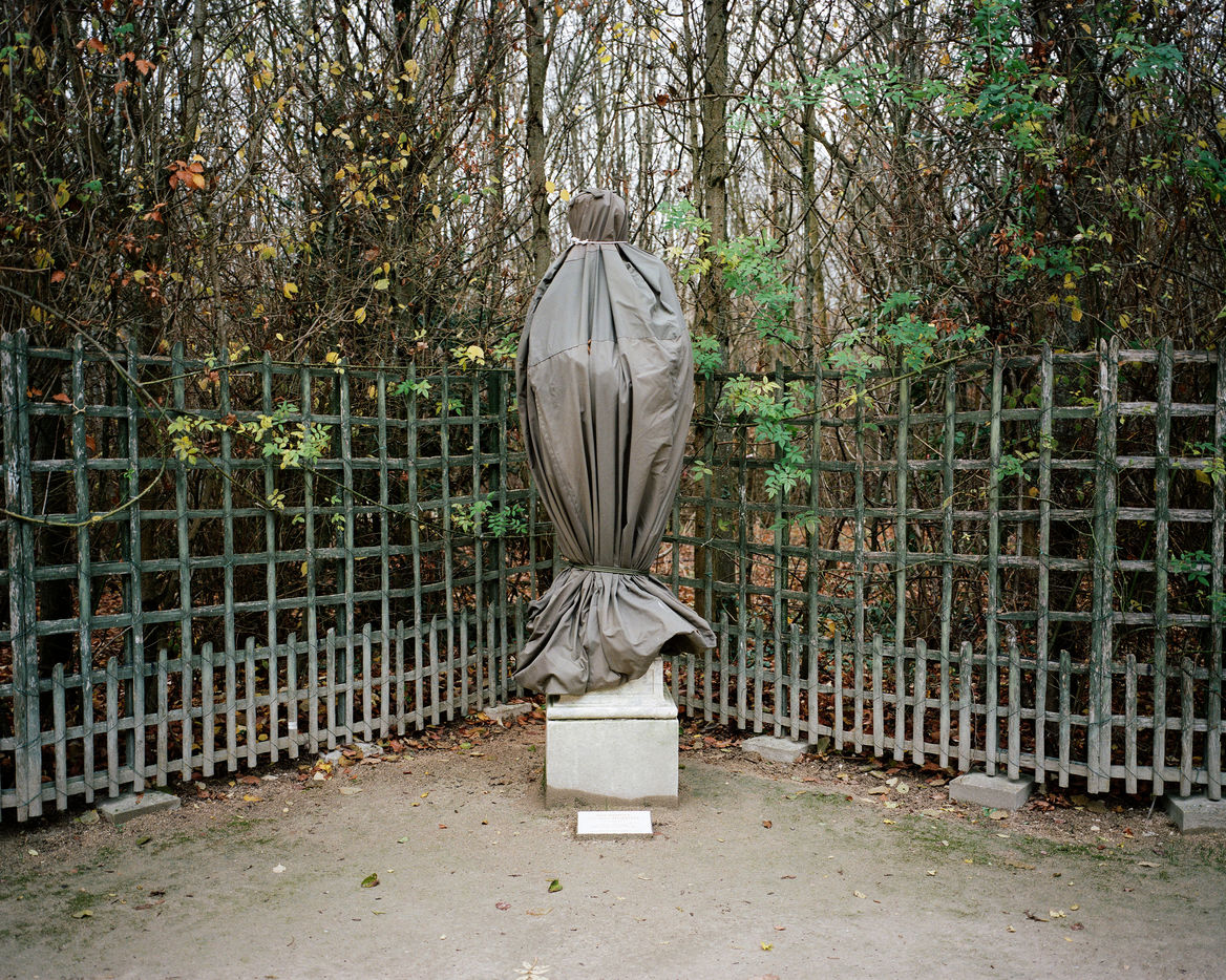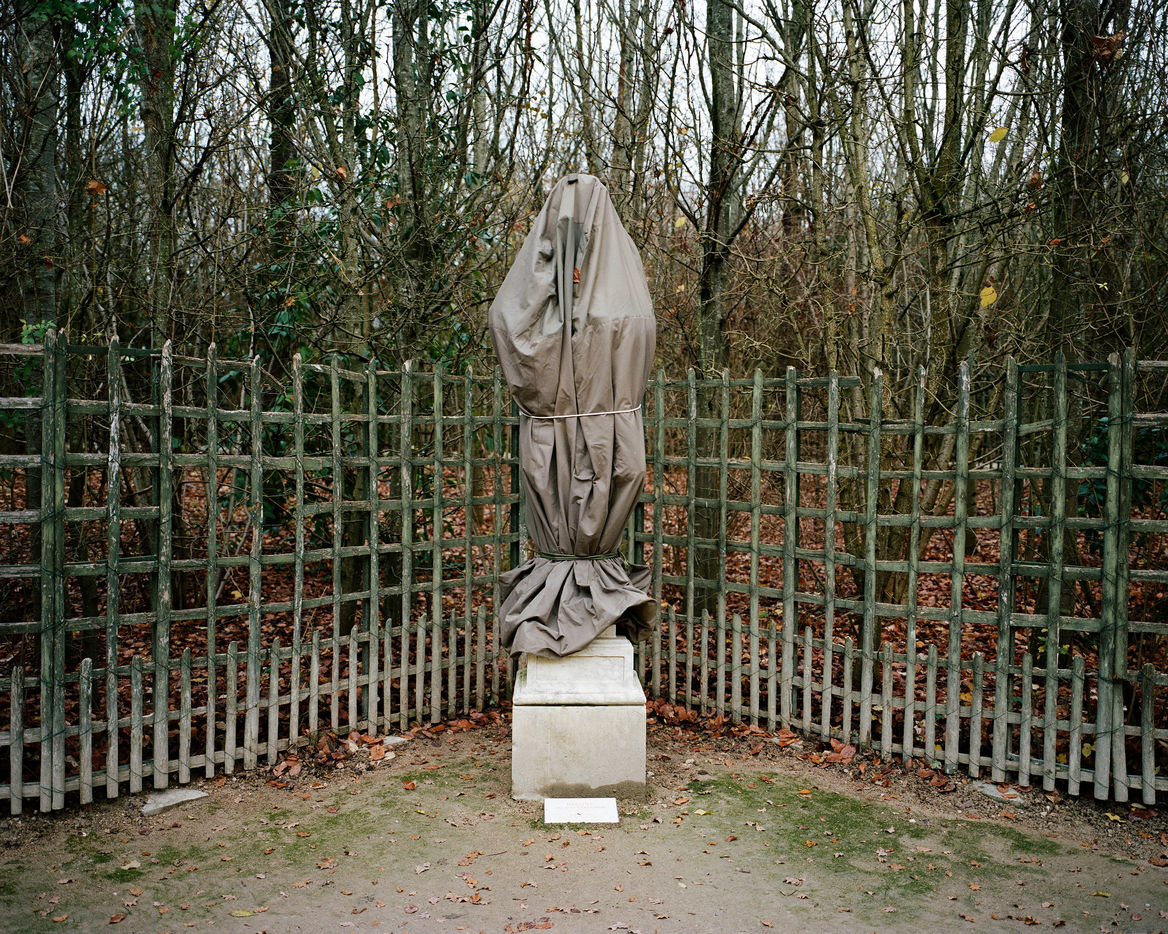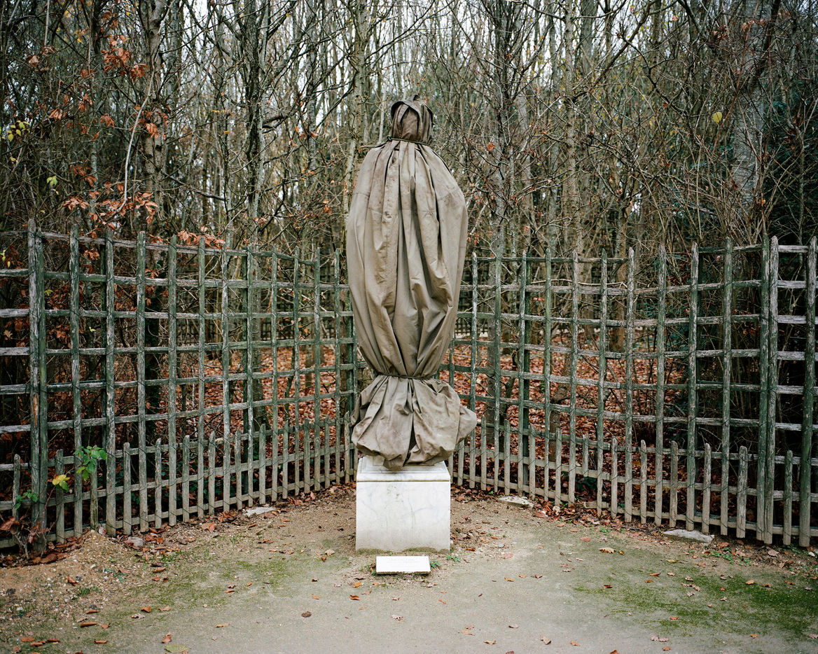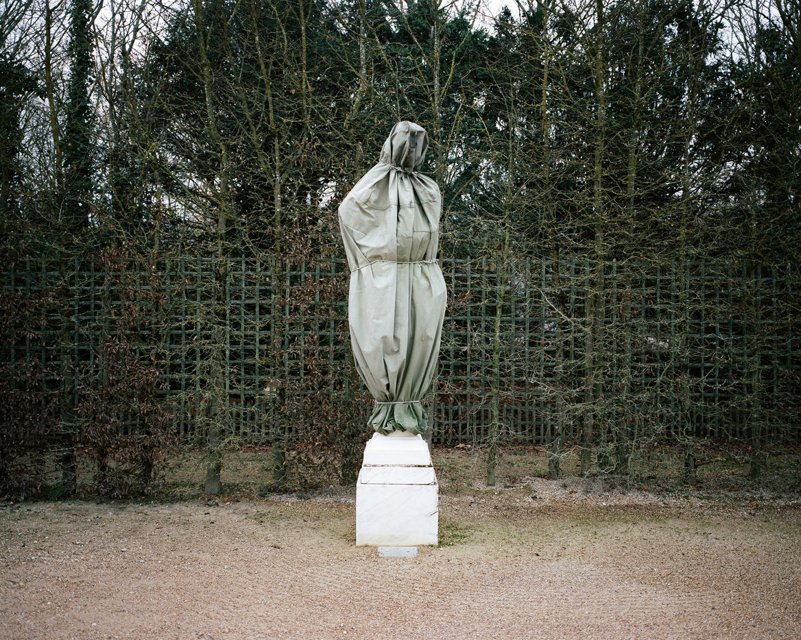 During winter, the statues in Versailles Castle's park are wrapped with canva to protect them from the cold.