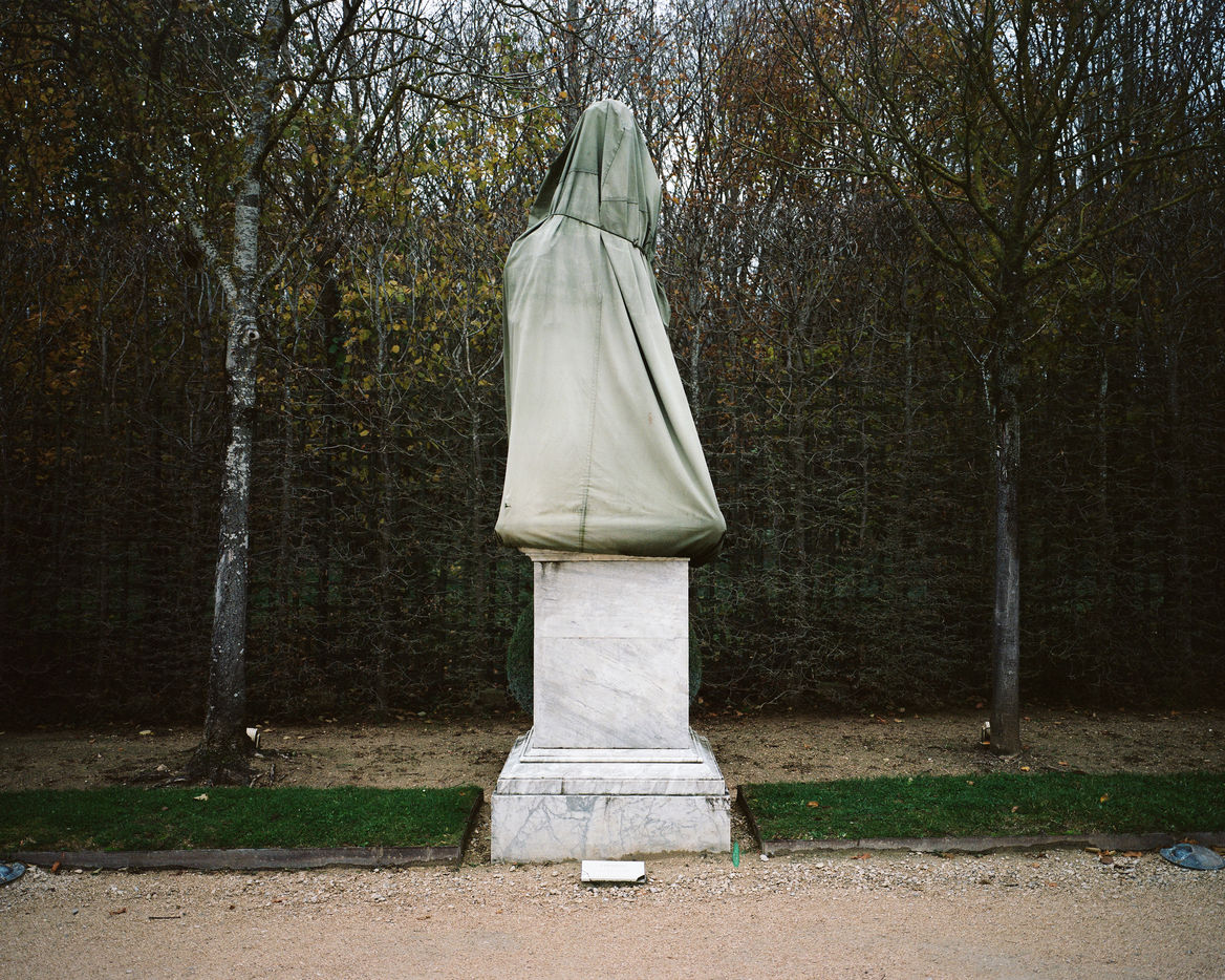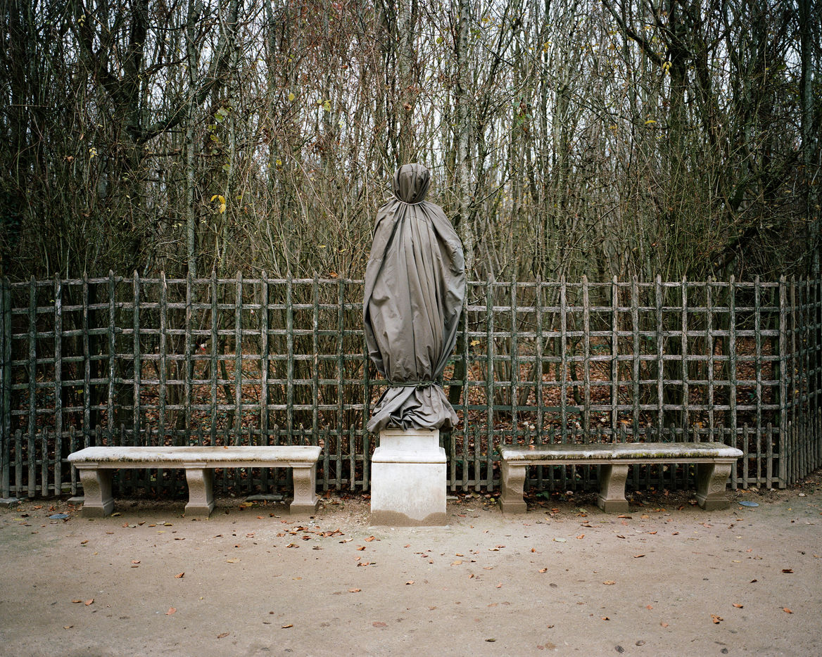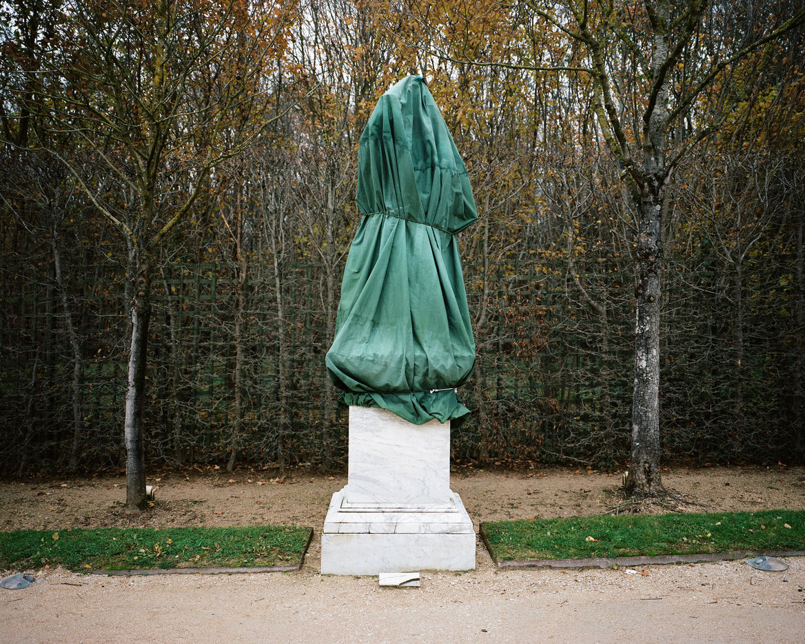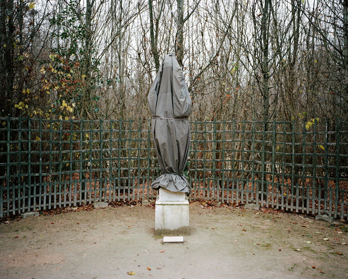 During winter, the statues in Versailles Castle's park are wrapped with canva to protect them from the cold.