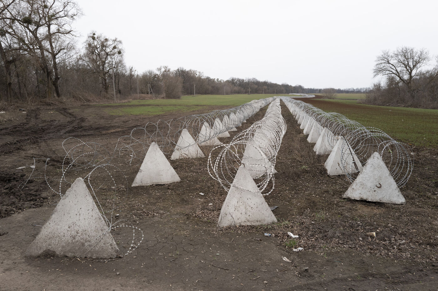 Soldiers from a Genie unit set up protective nets along a 10km stretch of road between the town of Sumy and the Russian border to protect civilian and military vehicles from Russian army suicide drones in the village of Pysarivka, Ukraine, on March 15, 2025.