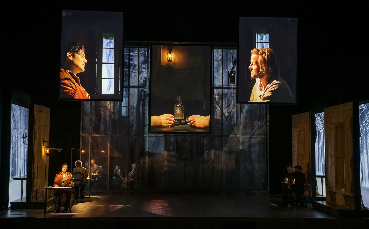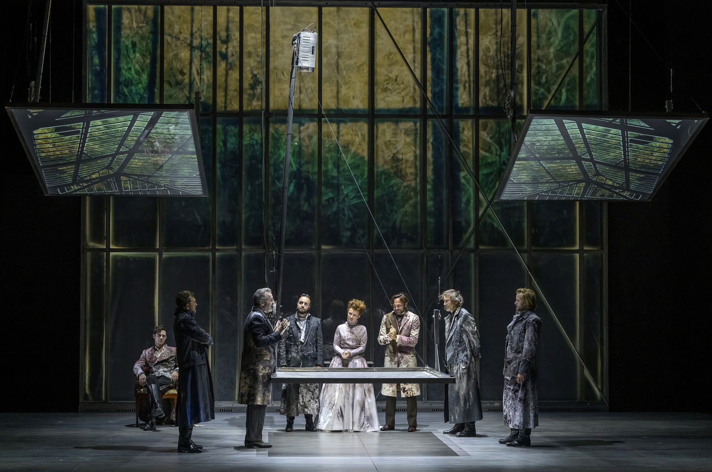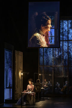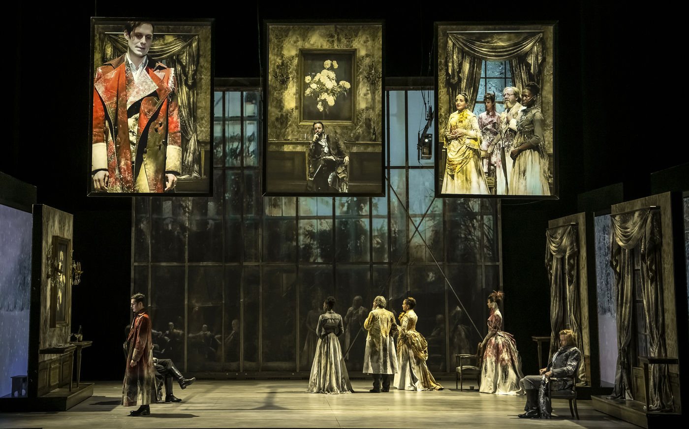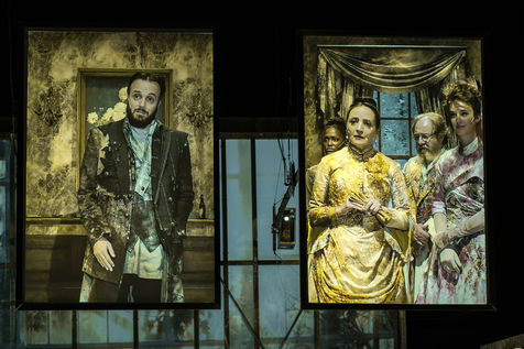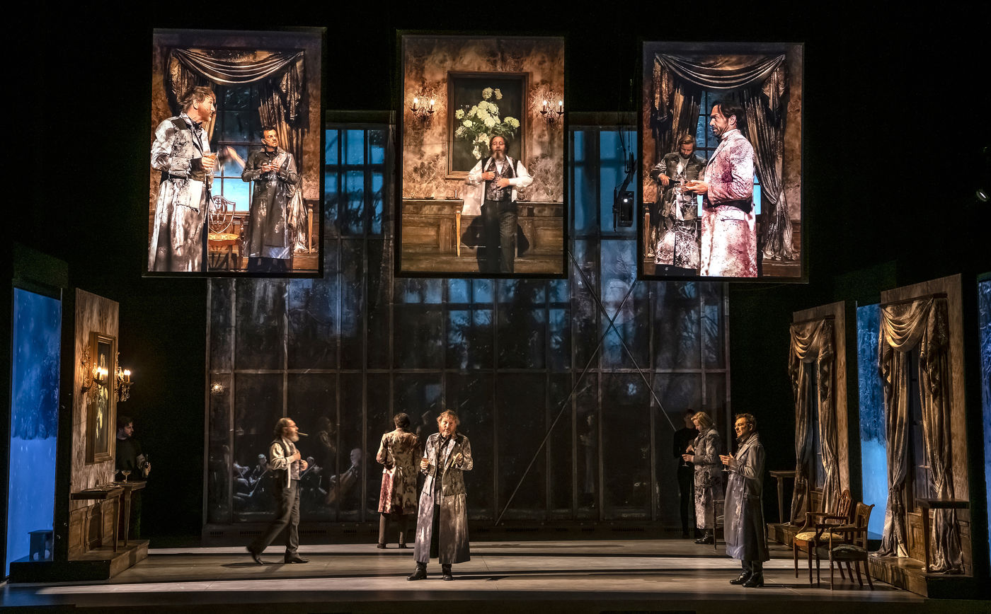 LES DEMONS d apres Fiodor Dostoievski, mise en scene Guy Cassiers avec Alexandre Pavloff (Chigaliov) Christian Gonon (Serguei Vassilitch Lipoutine) Julie Sicard (Arina Prokhorovna Virguinskaia) Serge Bagdassarian (Tolkatchenko) Herve Pierre (Stepane Trofimovitch Verkhovenski) Stephane Varupenne (Ivan Pavlovitch Chatov) Suliane Brahim (Maria Timofeievna Lebiadkina) Jeremy Lopez (Piotr Stepanovitch Verkhovenski) Christophe Montenez (Nikolai Vsevolodovitch Stavroguine) Dominique Blanc (Varvara Petrovna Stavroguina) Jennifer Decker (Liza) Clement Bresson (Virguinski) Claina Clavaron (Dacha)et les comediens de l academie Vianney Arcel, Robin Azema, Jeremy Berthoud, Heloise Cholley, Fanny Jouffroy, Emma Laristan a la Comedie Francaise salle Richelieu. Photographie de Pascal Gely / Hans Lucas
