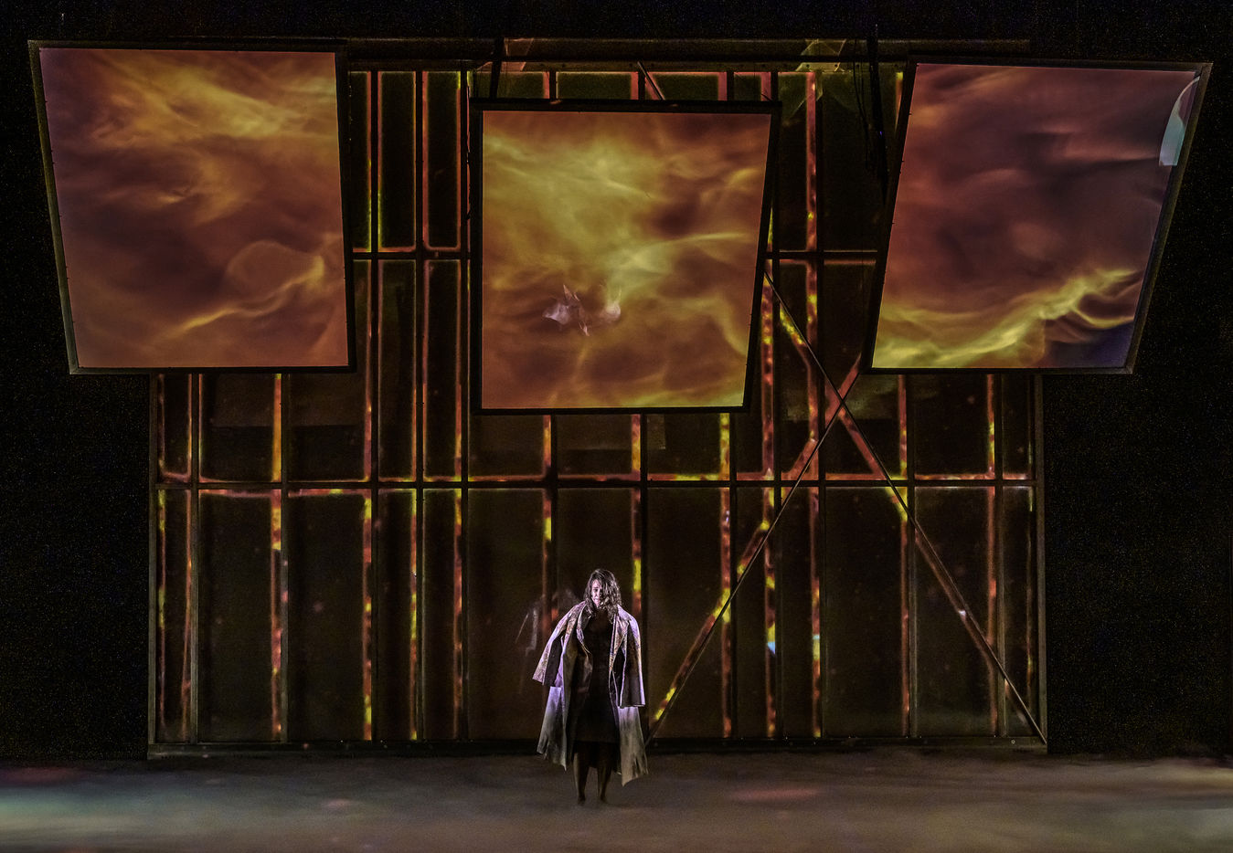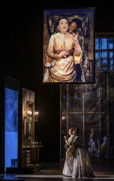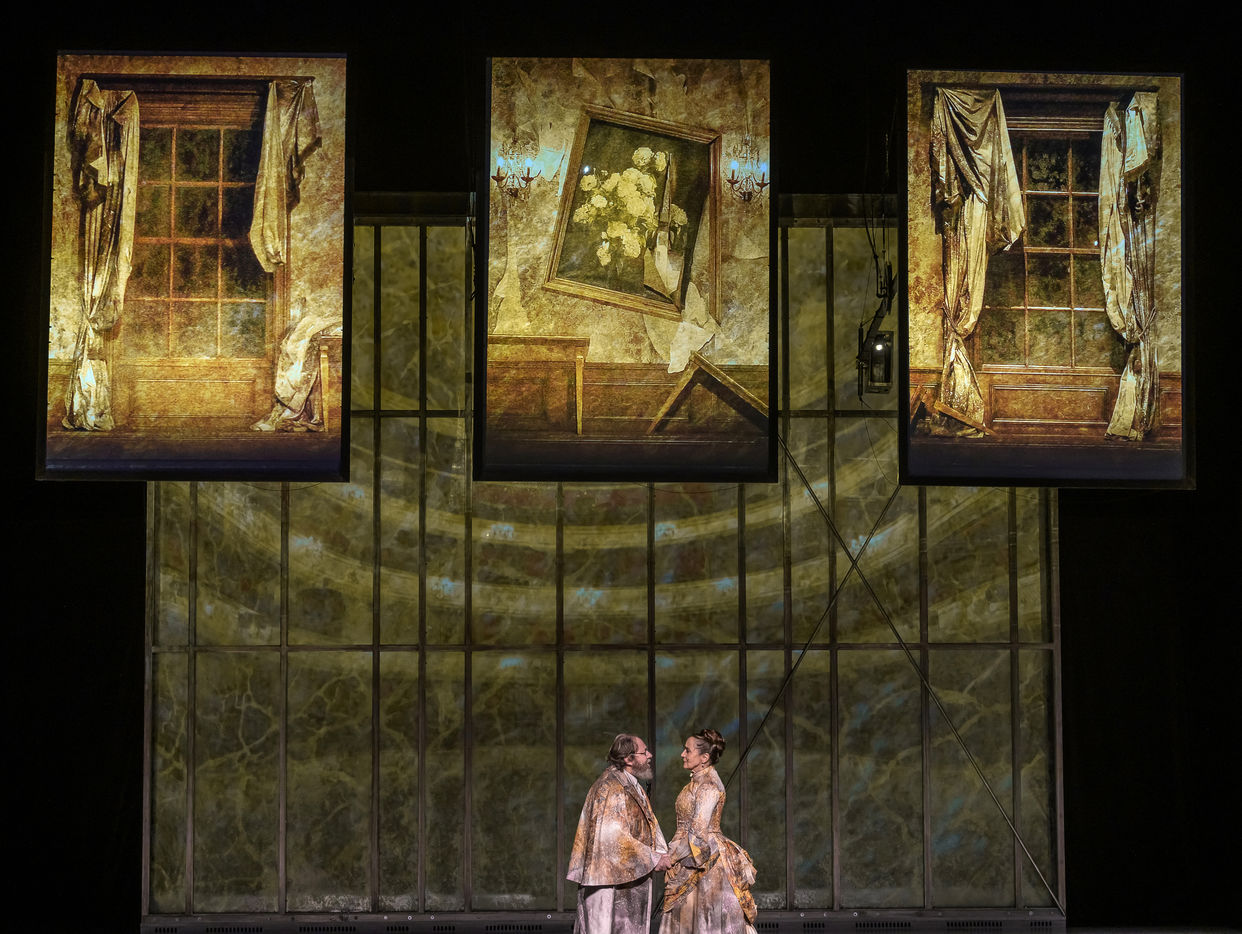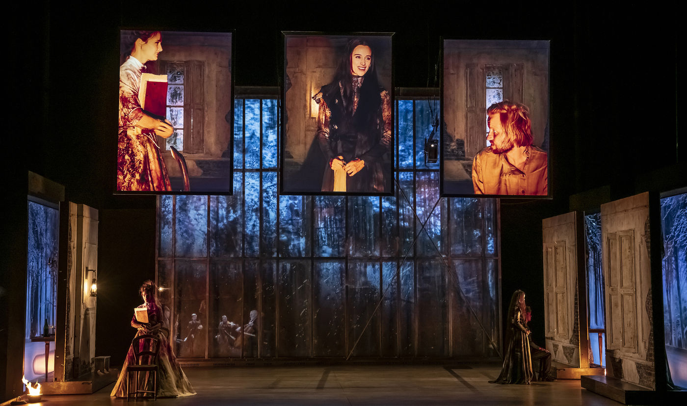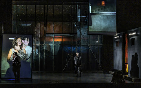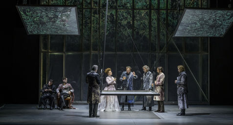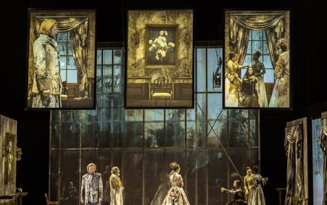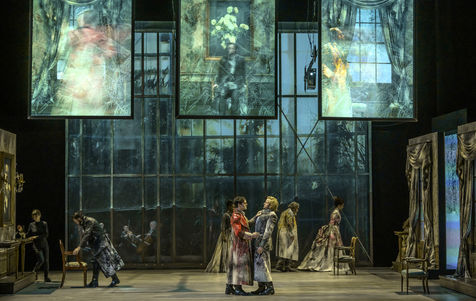 LES DEMONS d apres Fiodor Dostoievski, mise en scene Guy Cassiers avec Alexandre Pavloff (Chigaliov) Christian Gonon (Serguei Vassilitch Lipoutine) Julie Sicard (Arina Prokhorovna Virguinskaia) Serge Bagdassarian (Tolkatchenko) Herve Pierre (Stepane Trofimovitch Verkhovenski) Stephane Varupenne (Ivan Pavlovitch Chatov) Suliane Brahim (Maria Timofeievna Lebiadkina) Jeremy Lopez (Piotr Stepanovitch Verkhovenski) Christophe Montenez (Nikolai Vsevolodovitch Stavroguine) Dominique Blanc (Varvara Petrovna Stavroguina) Jennifer Decker (Liza) Clement Bresson (Virguinski) Claina Clavaron (Dacha)et les comediens de l academie Vianney Arcel, Robin Azema, Jeremy Berthoud, Heloise Cholley, Fanny Jouffroy, Emma Laristan a la Comedie Francaise salle Richelieu. Photographie de Pascal Gely / Hans Lucas