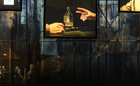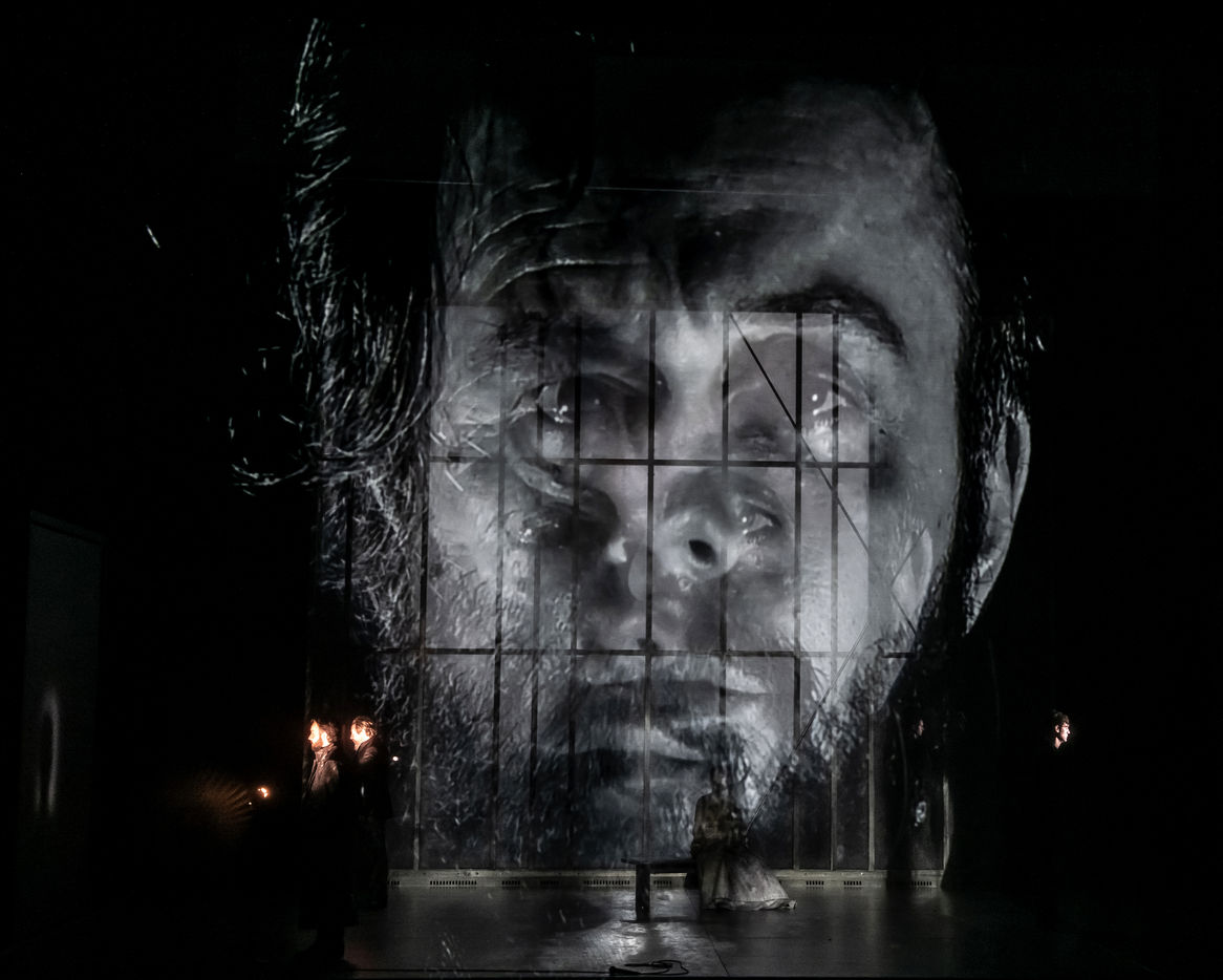 LES DEMONS according to Fiodor Dostoievski, directed by Guy Cassiers with Alexandre Pavloff (Chigaliov) Christian Gonon (Serguei Vassilitch Lipoutine) Julie Sicard (Arina Prokhorovna Virguinskaia) Serge Bagdassarian (Tolkatchenko) Herve Pierre (Stepane Trofimovitch Verkhovensky) Stephane Varupenne (Ivan Pavlovitch Khatov) Suliane Brahim. (Maria Timofeievna Lebiadkina) Jeremy Lopez (Piotr Stepanovitch Verkhovenski) Christophe Montenez (Nikolai Vsevolodovitch Stavroguine) Dominique Blanc (Varvara Petrovna Stavroguina) Jennifer Decker (Liza) Clement Bresson (Virguinski) Claina Clavaron (Dacha) and the actors from the academy Vianney Arcel, Robin Azema, Jeremy Berthoud, Heloise Cholley, Fanny Jouffroy, Emma Laristan at the Comedie Francaise hall Richelieu. Photography by Pascal Gely / Hans Lucas