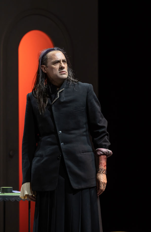 TARTUFFE THEOREME text by Moliere directed by Macha Makeieff with Xavier Gallais : Tartuffe, Vincent Winterhalter : Orgon, Jeanne-Marie Levy : madame Pernelle, Helene Bressiant : Elmire, Jin Xuan Mao : Cleante, Loic Mobihan : Damis, Nacima Bekhtaoui : Mariane, Jean-Baptiste Le Vaillant : Valere, Irina Solano : Dorine, Luis Fernando Perez : Laurent and Pascal Ternisien : Flipote at the Theatre National de la Criee Marseille. Photograph by Pascal Gely / Hans Lucas
