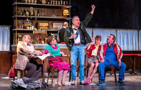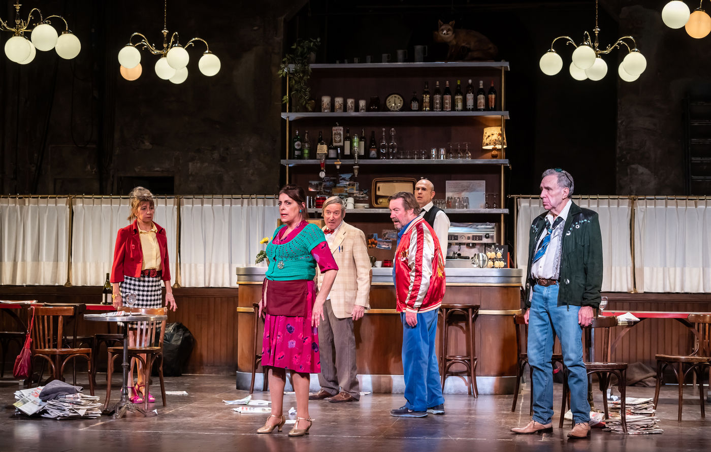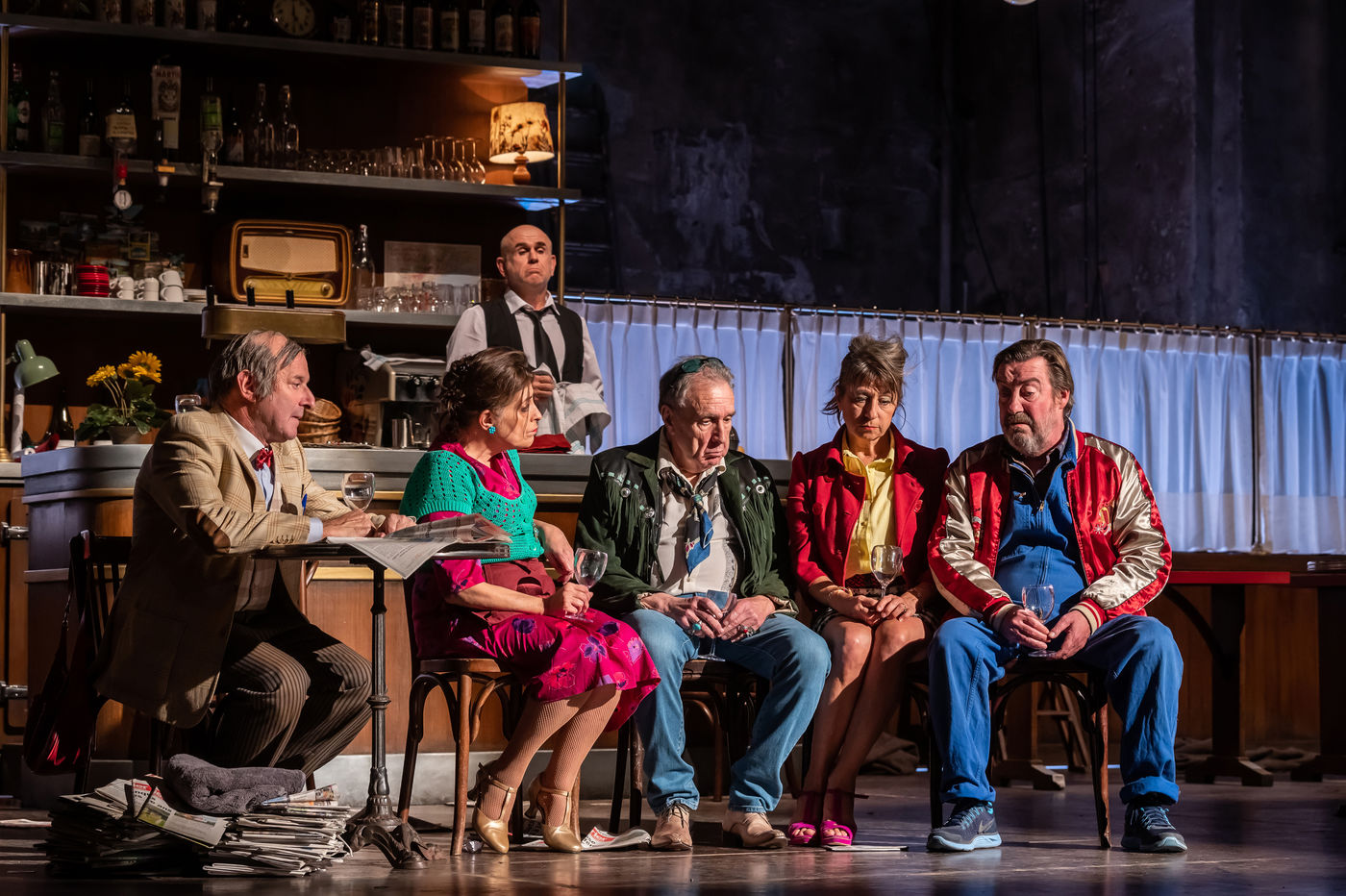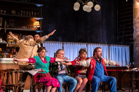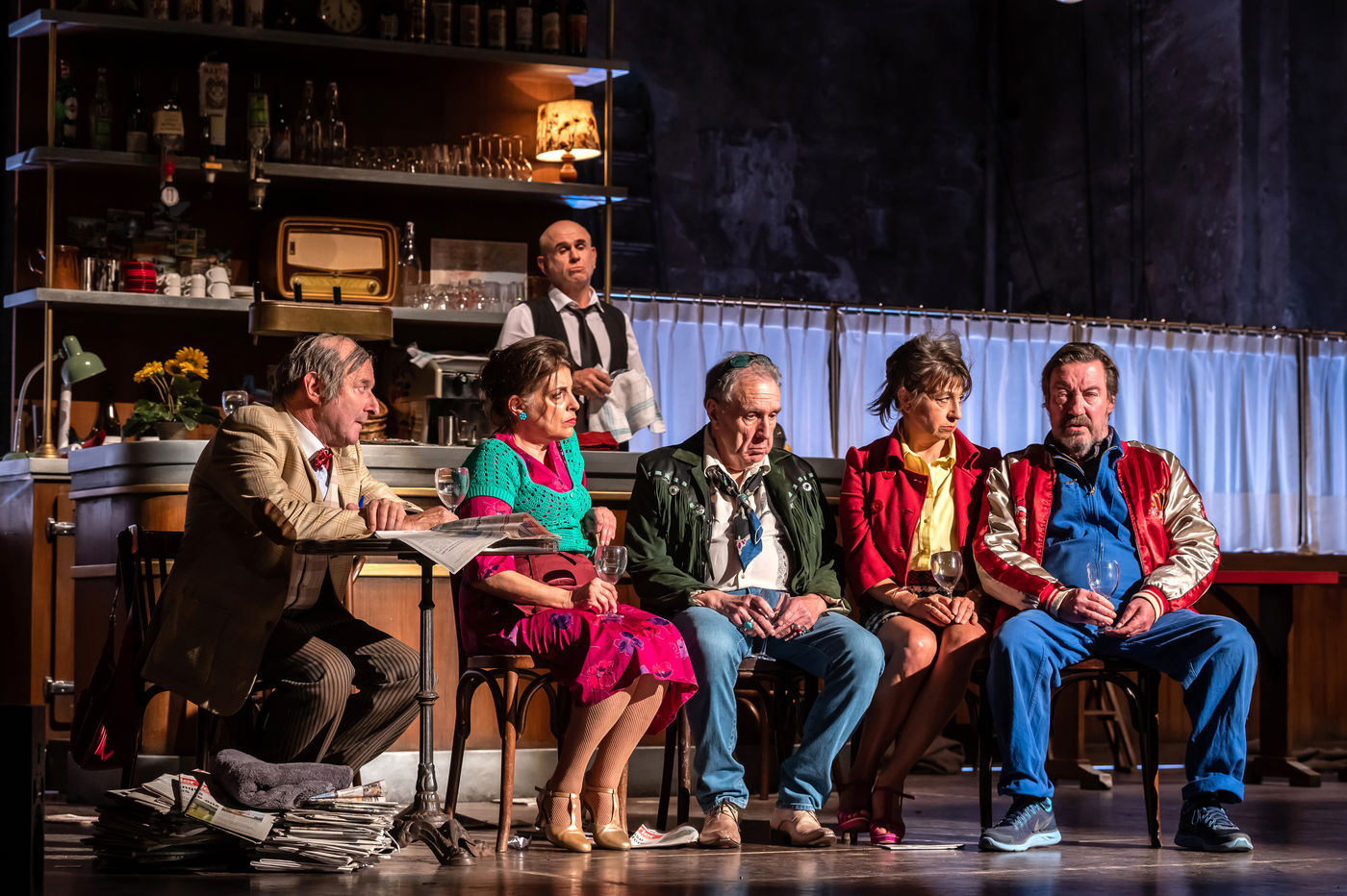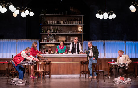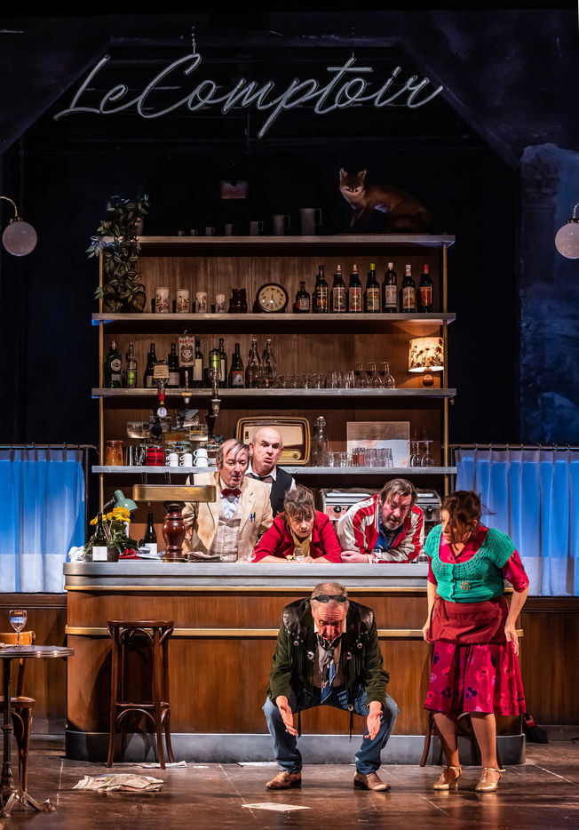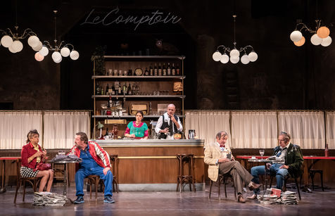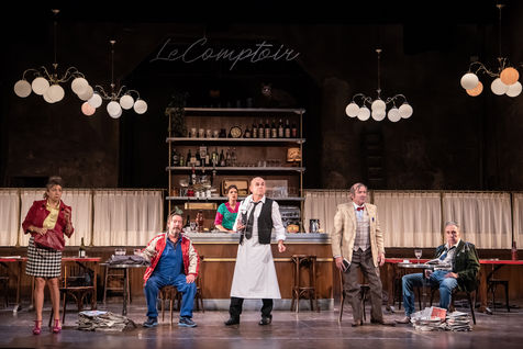 BREVES DE COMPTOIR TOURNEE GENERALE texte de Jean-Marie Gourio mise en scene de Jean-Michel Ribes avec Philippe Duquesne, Nanou Garcia, Gilles Gaston-Dreyfus, Philippe Magnan, Marie-Christine Orry et Philippe Vieux au Theatre de l Atelier. Photographie de Pascal Gely / Hans Lucas