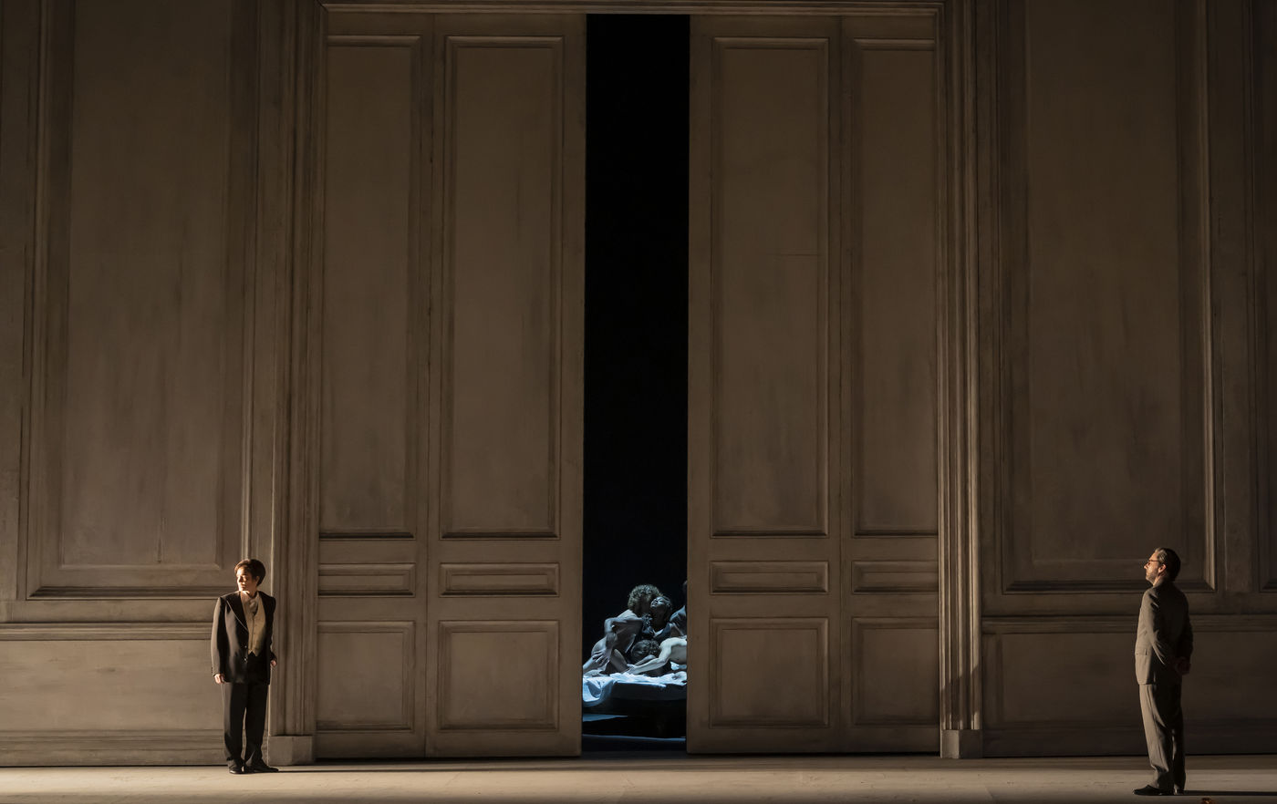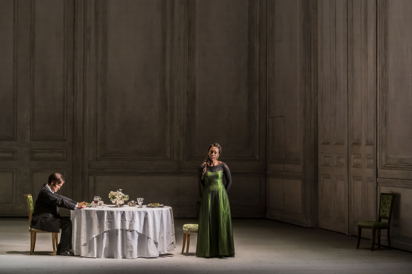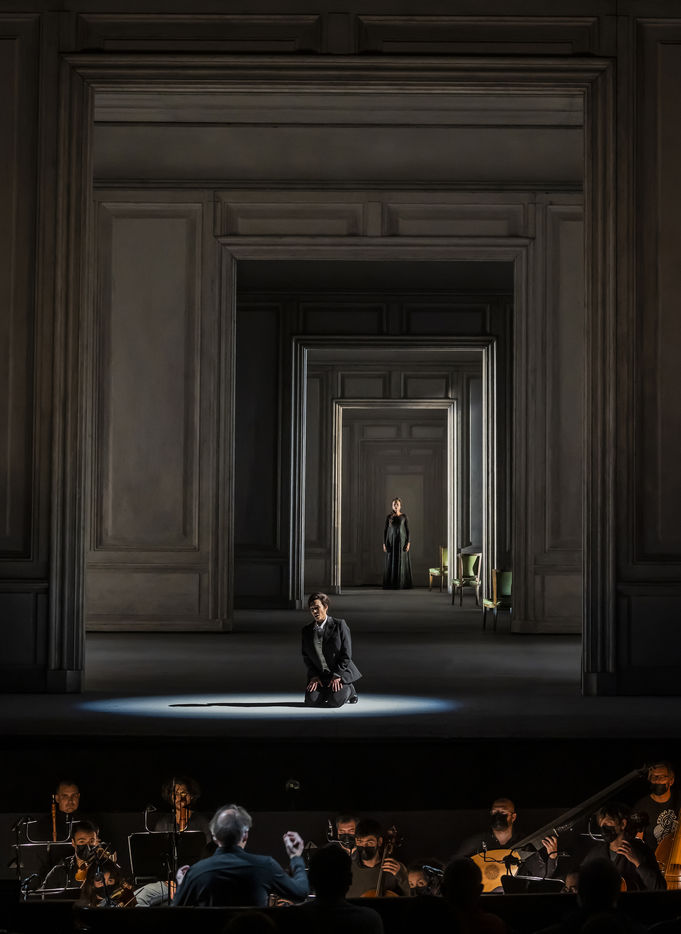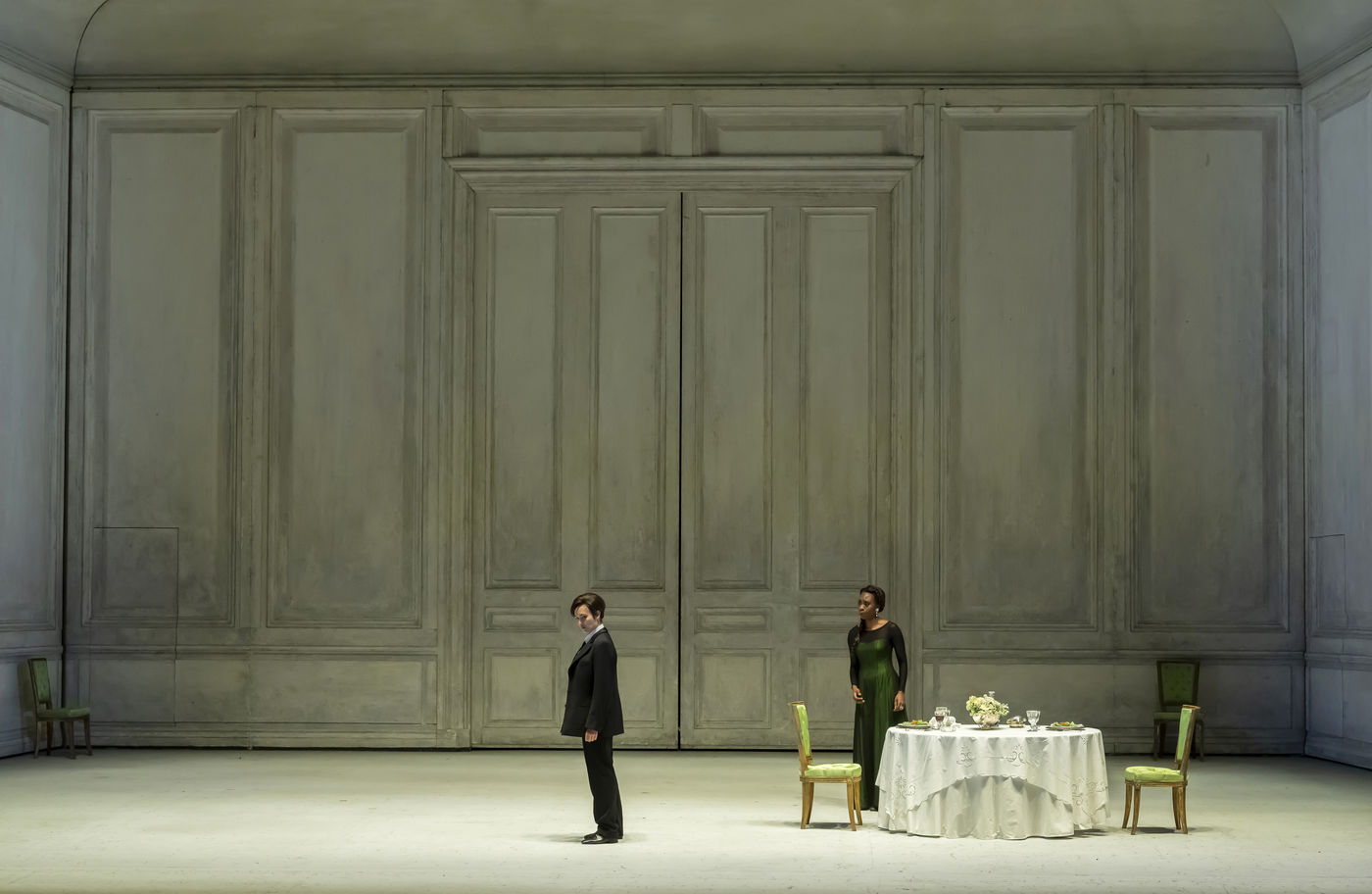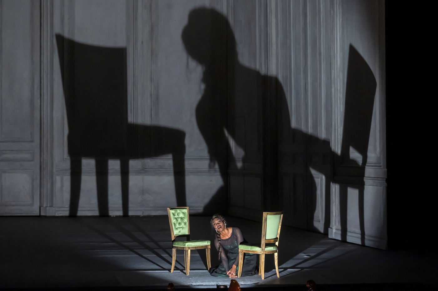 ALCINA musique Georg Freidrich Haendel direction musicale Thomas Hengelbrock mise en scene Robert Carsen avec Jeanine De Bique : Alcina, Gaelle Arquez : Ruggiero, Sabine Devieilhe : Morgana, Roxana Constantinescu : Bradamante, Rupert Charlesworth : Oronte et Nicolas Courjal : Melisso : Melisso a l Opera National de Paris Palais Garnier. Photographie de Pascal Gely / Hans Lucas