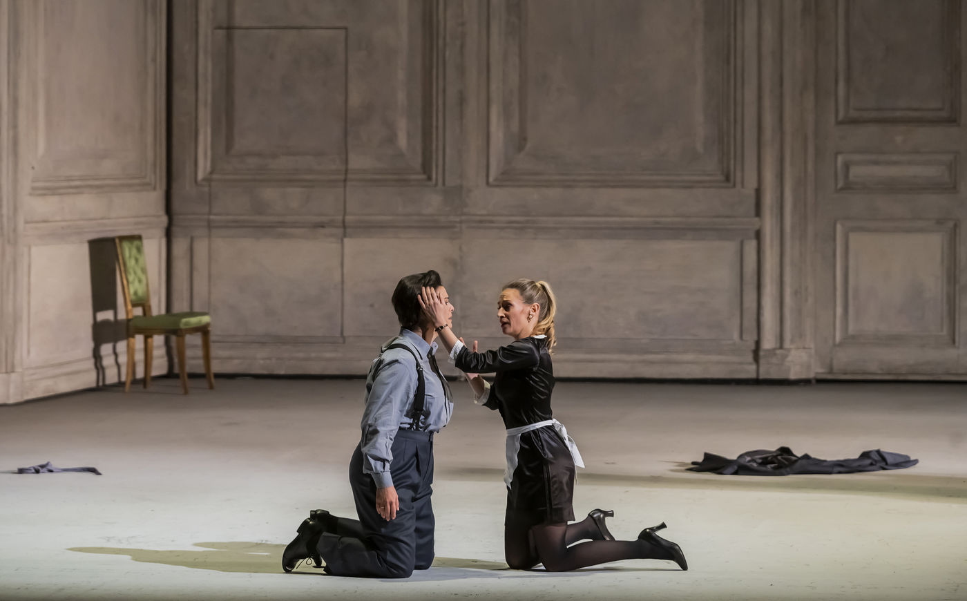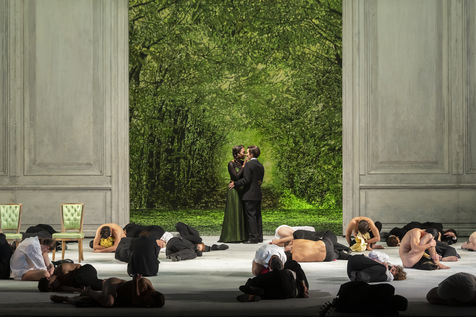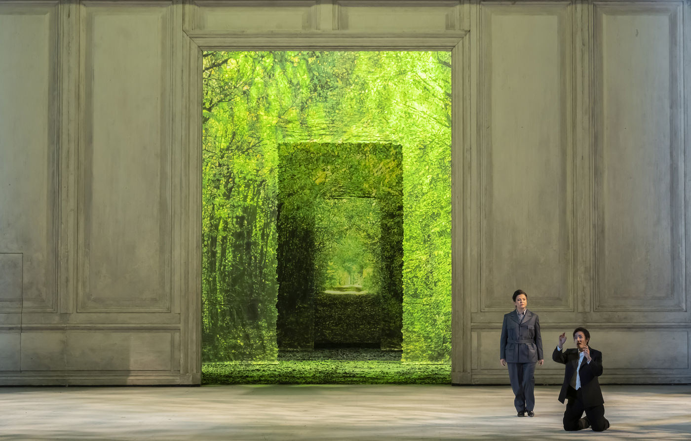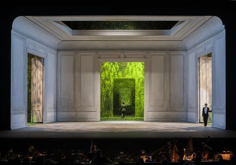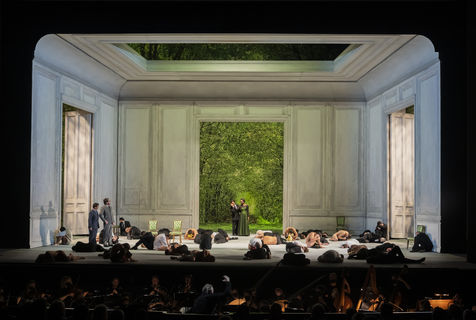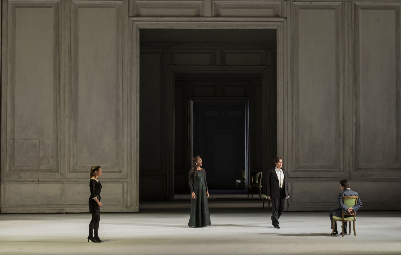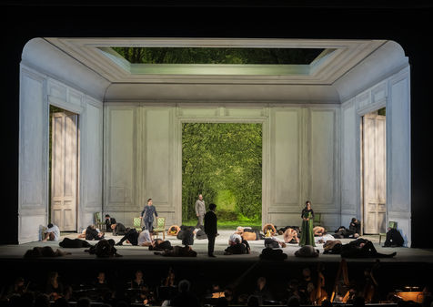 ALCINA music by Georg Freidrich Haendel music direction by Thomas Hengelbrock stage direction by Robert Carsen with Jeanine De Bique : Alcina, Gaelle Arquez : Ruggiero, Sabine Devieilhe : Morgana, Roxana Constantinescu : Bradamante, Rupert Charlesworth : Oronte and Nicolas Courjal : Melisso : Melisso at the Opera National de Paris Palais Garnier. Photograph by Pascal Gely / Hans Lucas