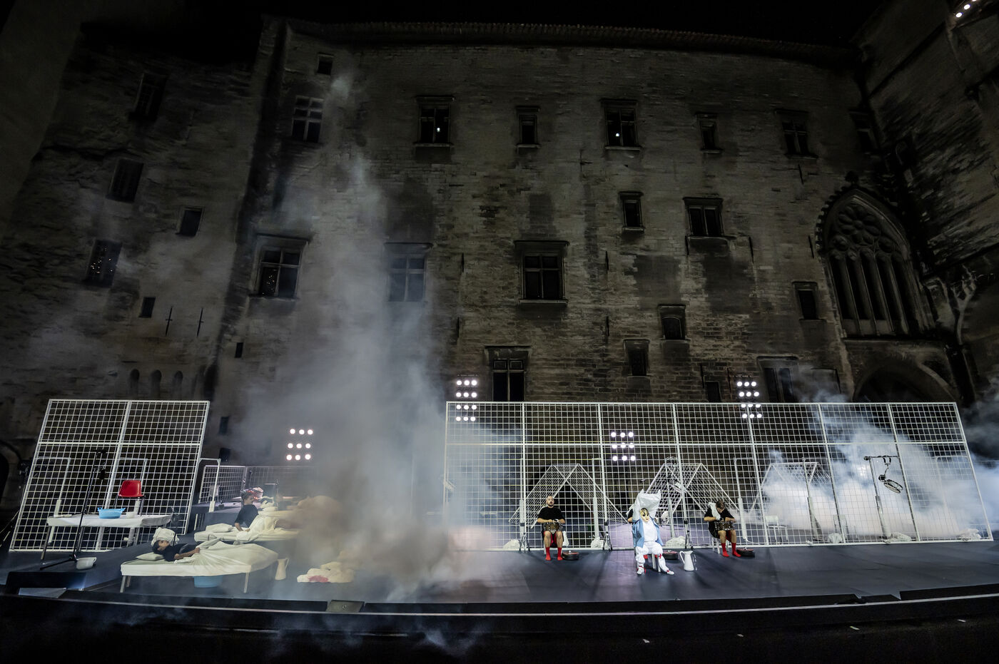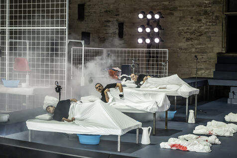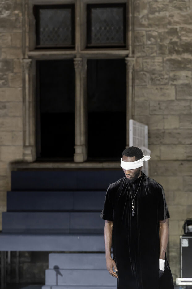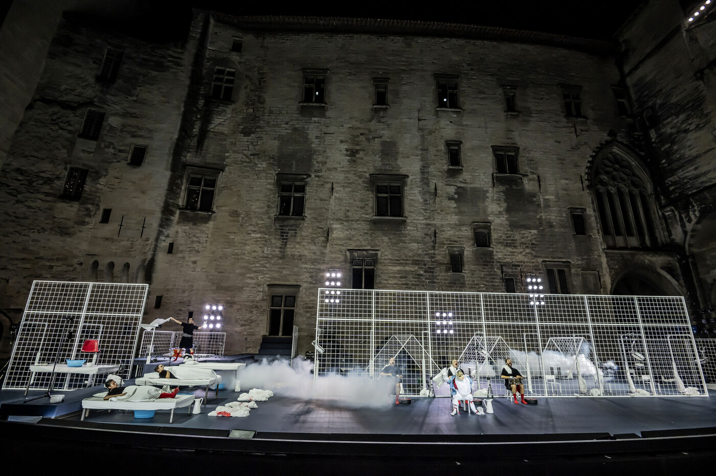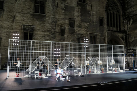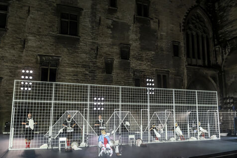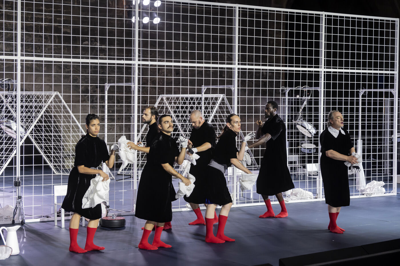 NOT Choreography by Marlene Monteiro Freitas with Marie Albert, Joaozinho da Costa, Miguel Filipe, Ben Green, Henri « Cookie » Lesguillier, Tomas Boital, Rui Paixao and Marian Freitas at the Cour d Honneur du Palais des Papes Avignon. Photograph by Pascal Gely / Hans Lucas