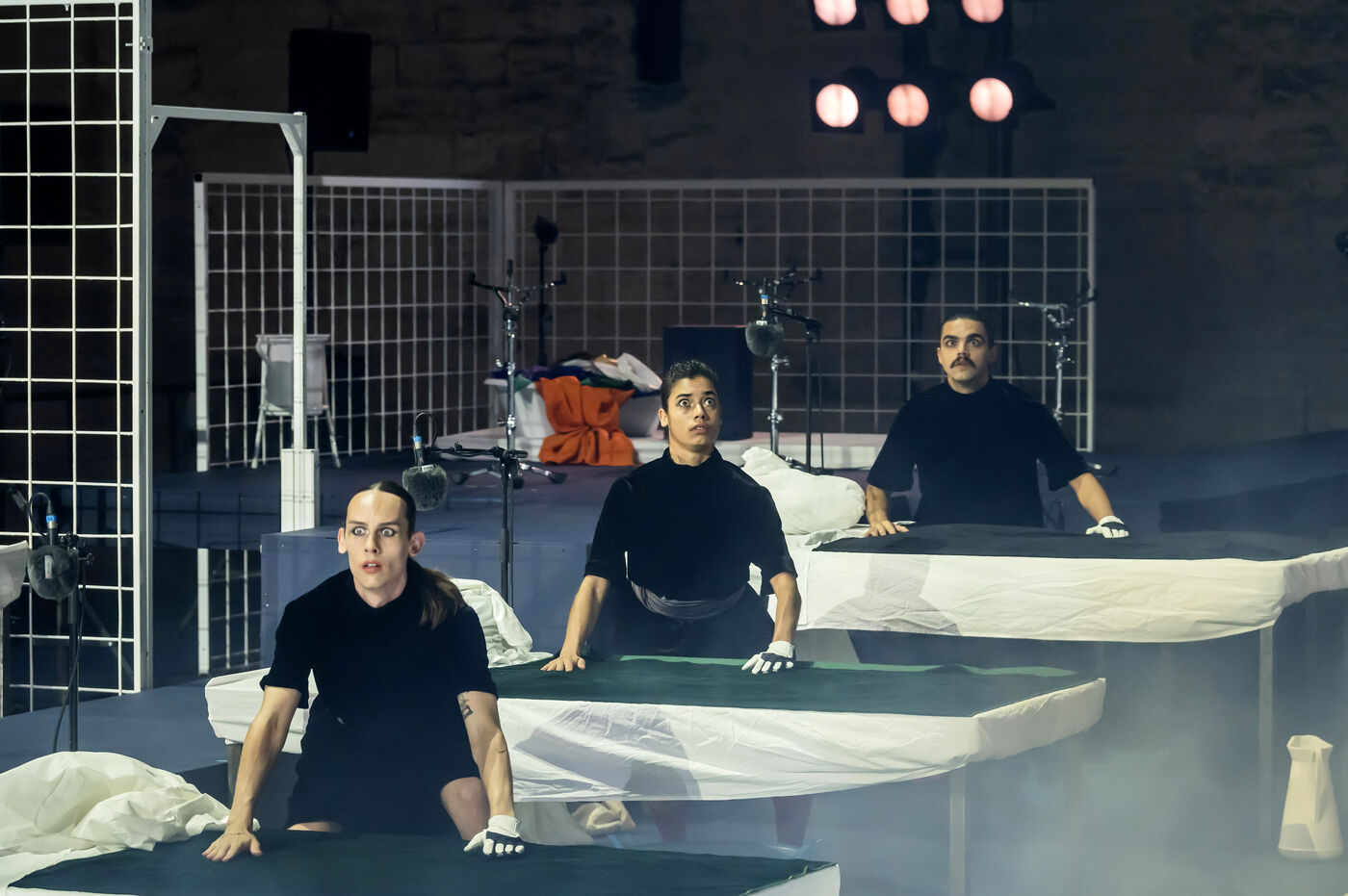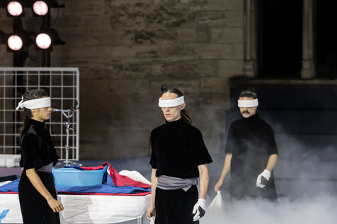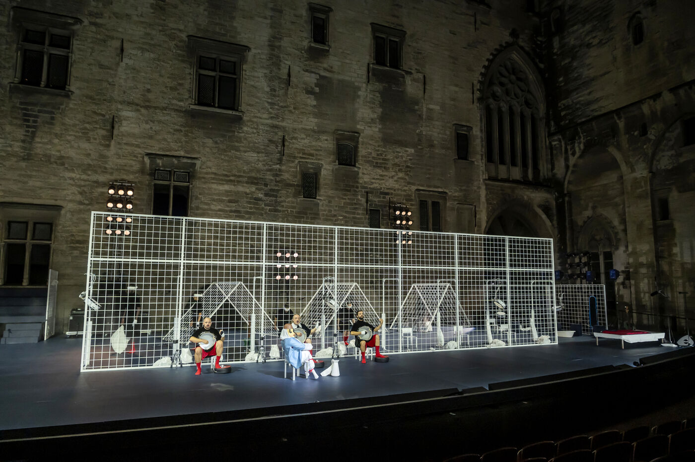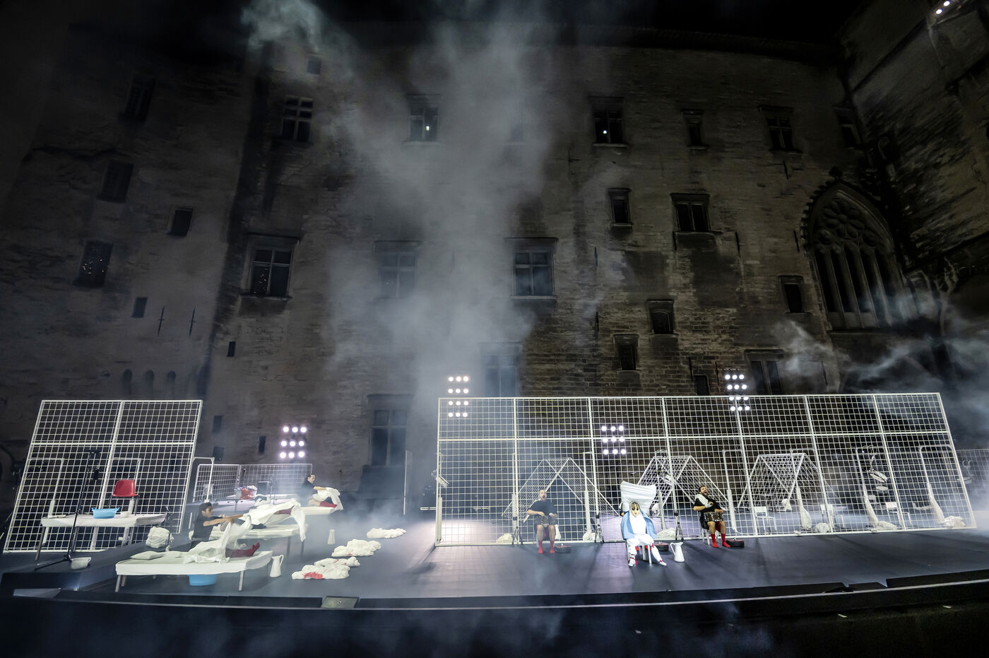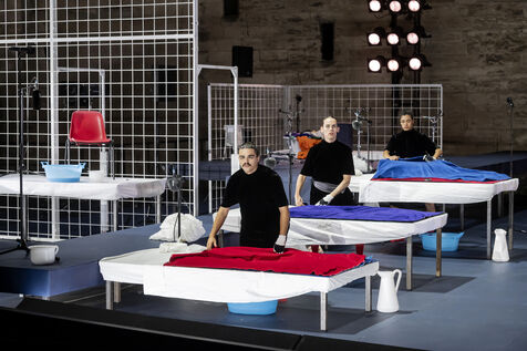 NOT Choreography by Marlene Monteiro Freitas with Marie Albert, Joaozinho da Costa, Miguel Filipe, Ben Green, Henri « Cookie » Lesguillier, Tomas Boital, Rui Paixao and Marian Freitas at the Cour d Honneur du Palais des Papes Avignon. Photograph by Pascal Gely / Hans Lucas