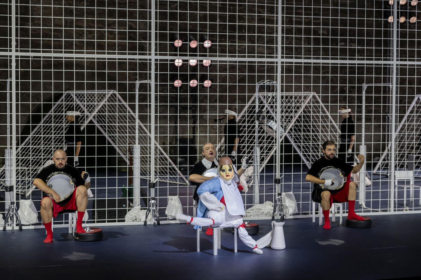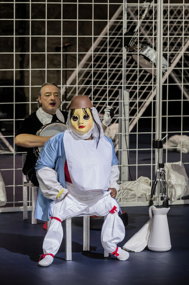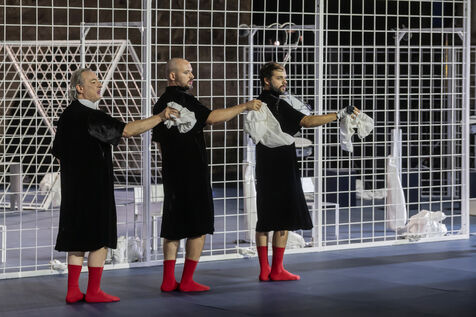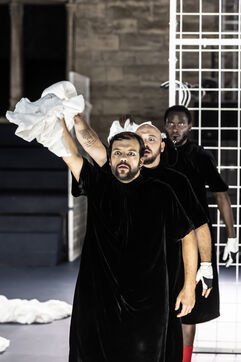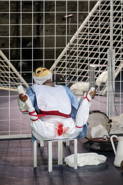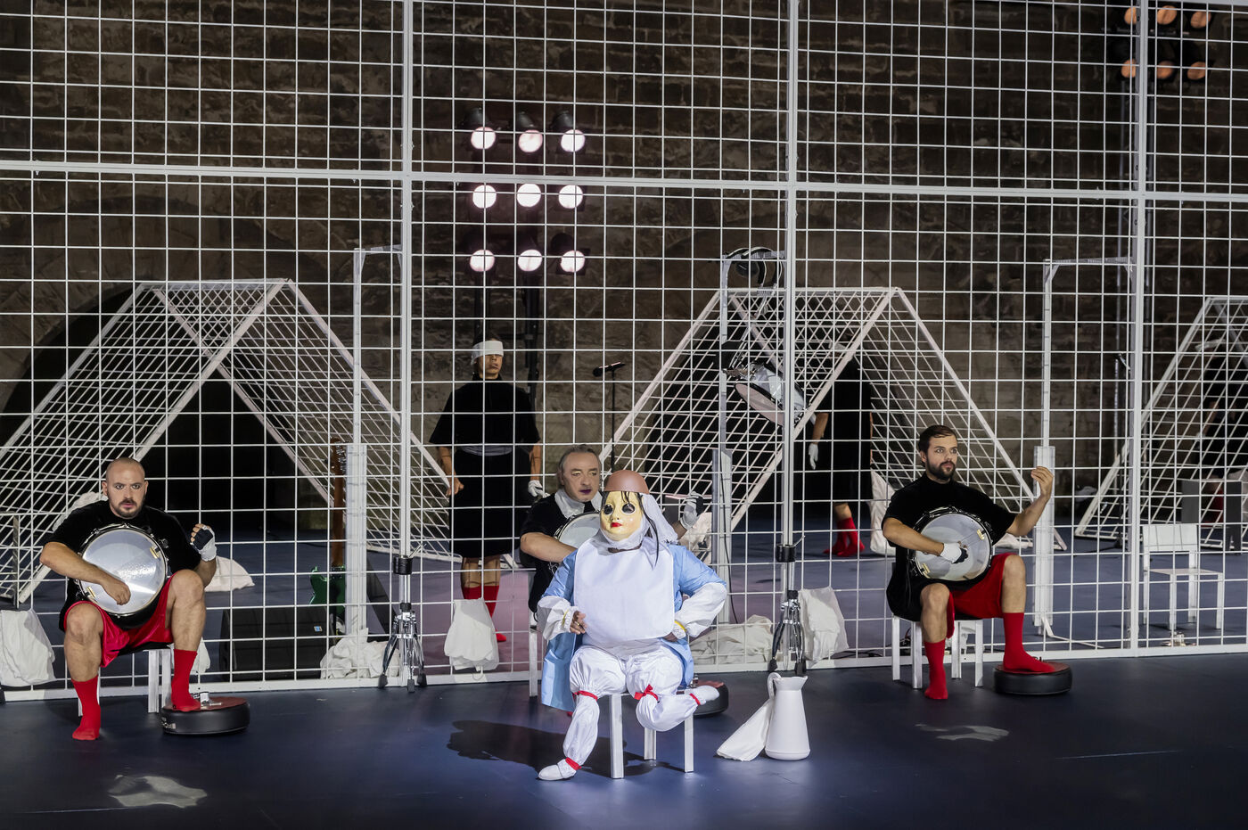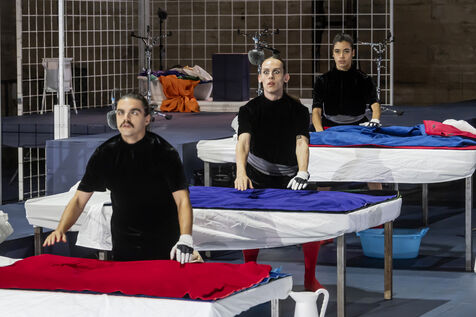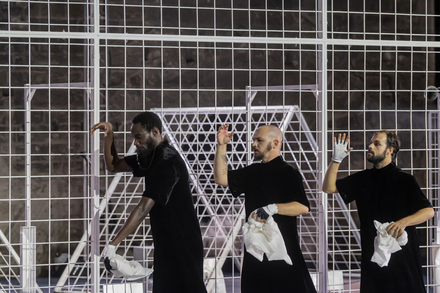 NOT Choreography by Marlene Monteiro Freitas with Marie Albert, Joaozinho da Costa, Miguel Filipe, Ben Green, Henri « Cookie » Lesguillier, Tomas Boital, Rui Paixao and Marian Freitas at the Cour d Honneur du Palais des Papes Avignon. Photograph by Pascal Gely / Hans Lucas