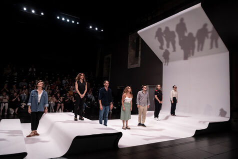 AFFAIRES FAMILIALES Conception, text and stage direction by Emilie Rousset with Saadia Bentaieb, Antonia Buresi, Teresa Coutinho, Ruggero Franceschini, Emmanuelle Lafon, Nuria Lloansi and Manuel Vallade at the Tinel de la chartreuse de Villeneuve lez Avignon. Photograph by Pascal Gely / Hans Lucas