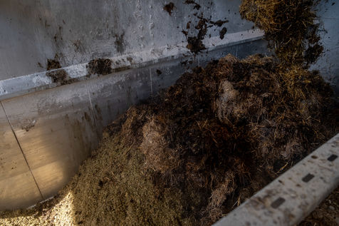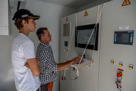 The unit is run by the association of 11 farmers wanting to find a common solution for the disposal of their farms' organic waste and eager to take part in a more circular economy. They now take turns to make sure the two digesters, where the organic wastes ferment, are running smoothly. Romain, a young intern from Pau-Montardon agricultural college is feeding the tanks with a simple mix of manure, corn silage and other intermediate energy crops from neighboring farms. Each year, by the action of heat, 30 000 tons of organic waste are transformed into biogas and digestate. An equal amount (30 000 tons) of digestate can then be used as a fertilizer, through soil nourrishment and humification, contributing to the recycling of the organic waste promoted by circular economy. The biogas, composed of methane (CH4) and carbon dioxyde (C02) can either be used as direct fuel, fuel for electricity production or, as it is the case in