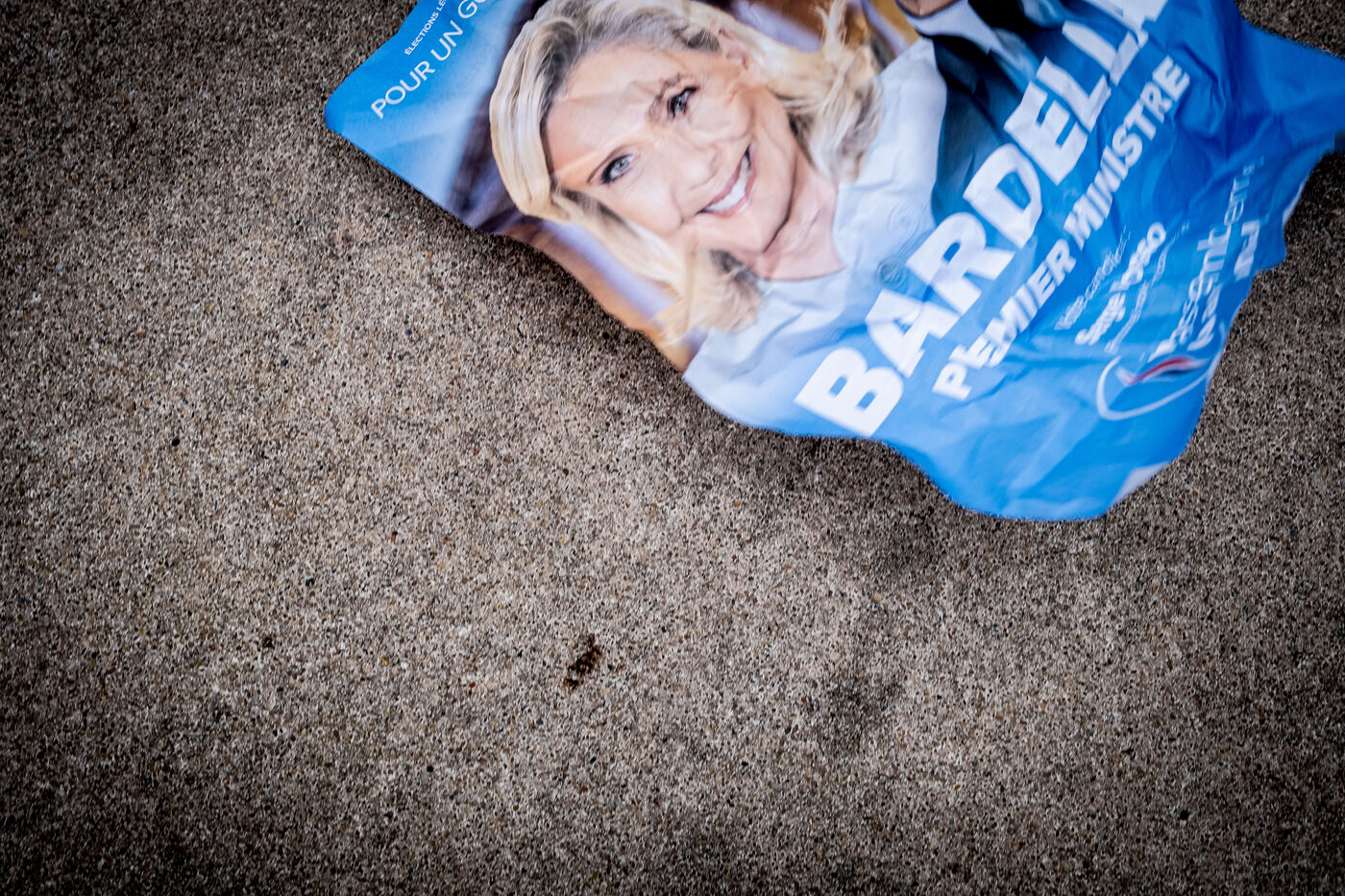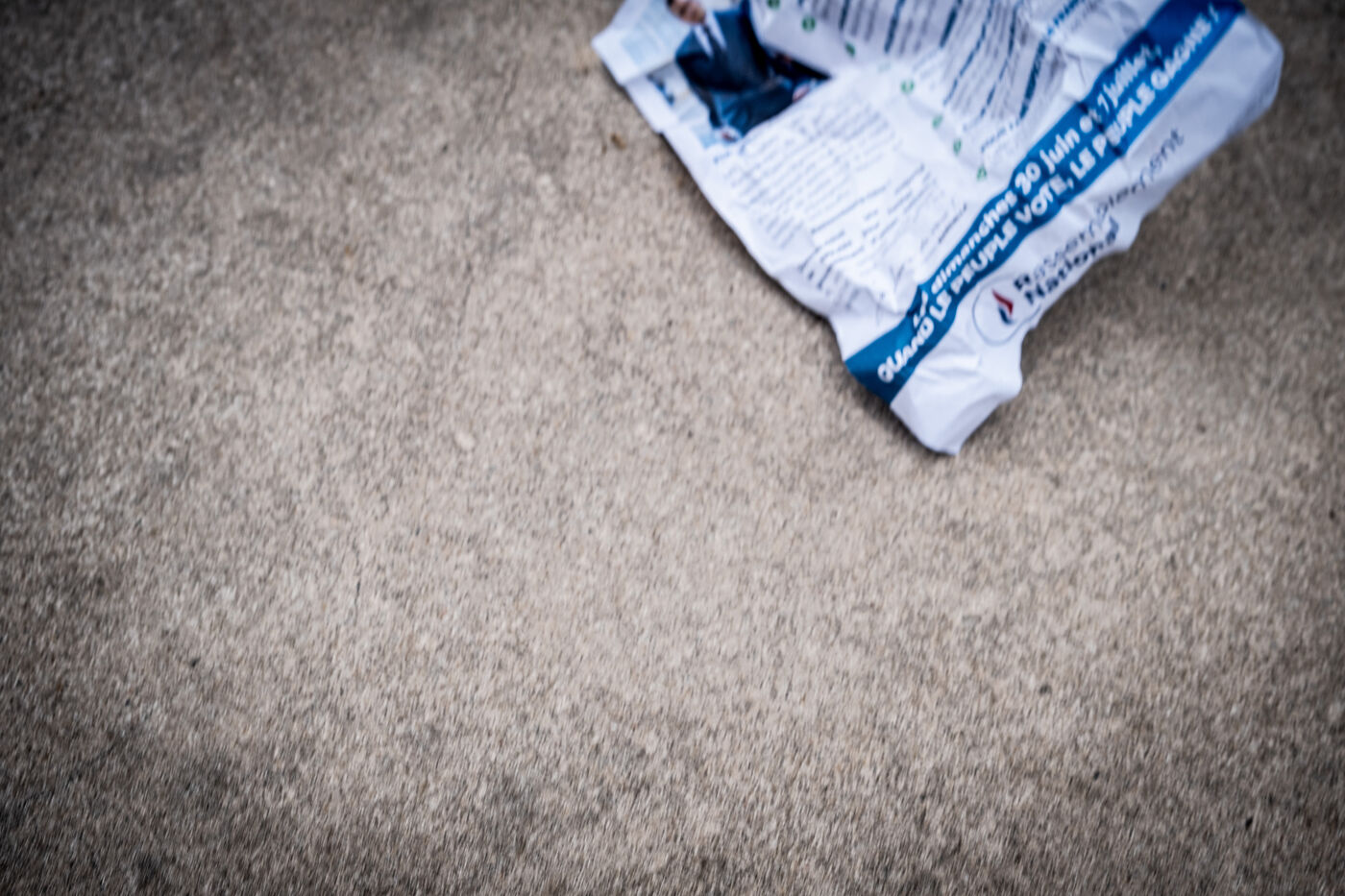 Rassemblement National candidate's, Jordan Bardella, crumpled electoral leaflet.