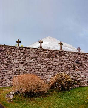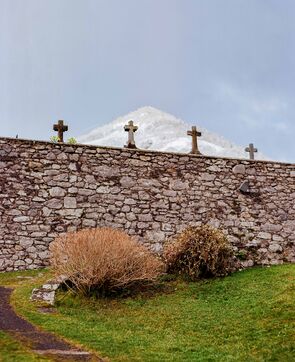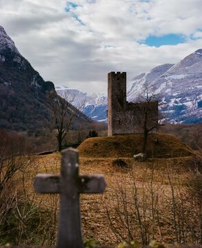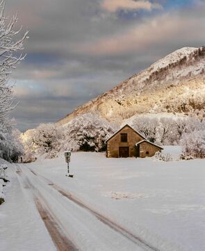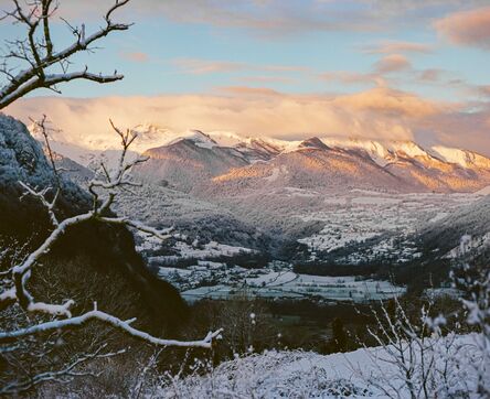 Le village Pyréneen de Castet, sur fond vertical et enneigé, le col de Port de Castet qui le surplombe, plateau de pâturages et de forêts offre un paysage qui allie grands espaces pastoraux et zones forestières face au Plateau du Bénou, sur le versant ouest de la Vallée d’Ossau.