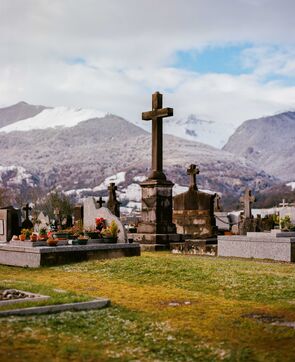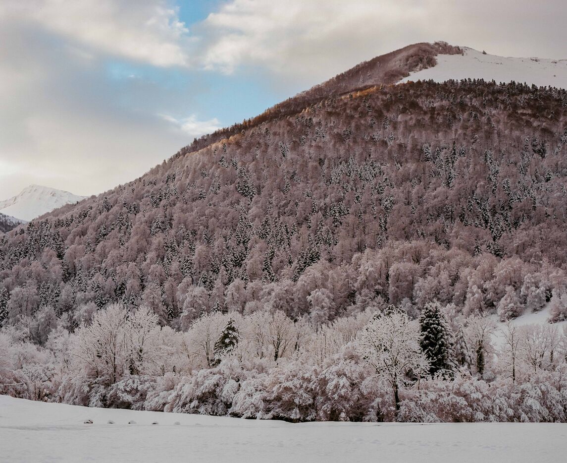 Castet against the white and vertical backdrop. The mountain pass above, Port de Castet, plateau of pastures and forests offers a landscape which combines large pastoral spaces and forest areas facing the Bénou Plateau, on the western slope of the Ossau Valley.