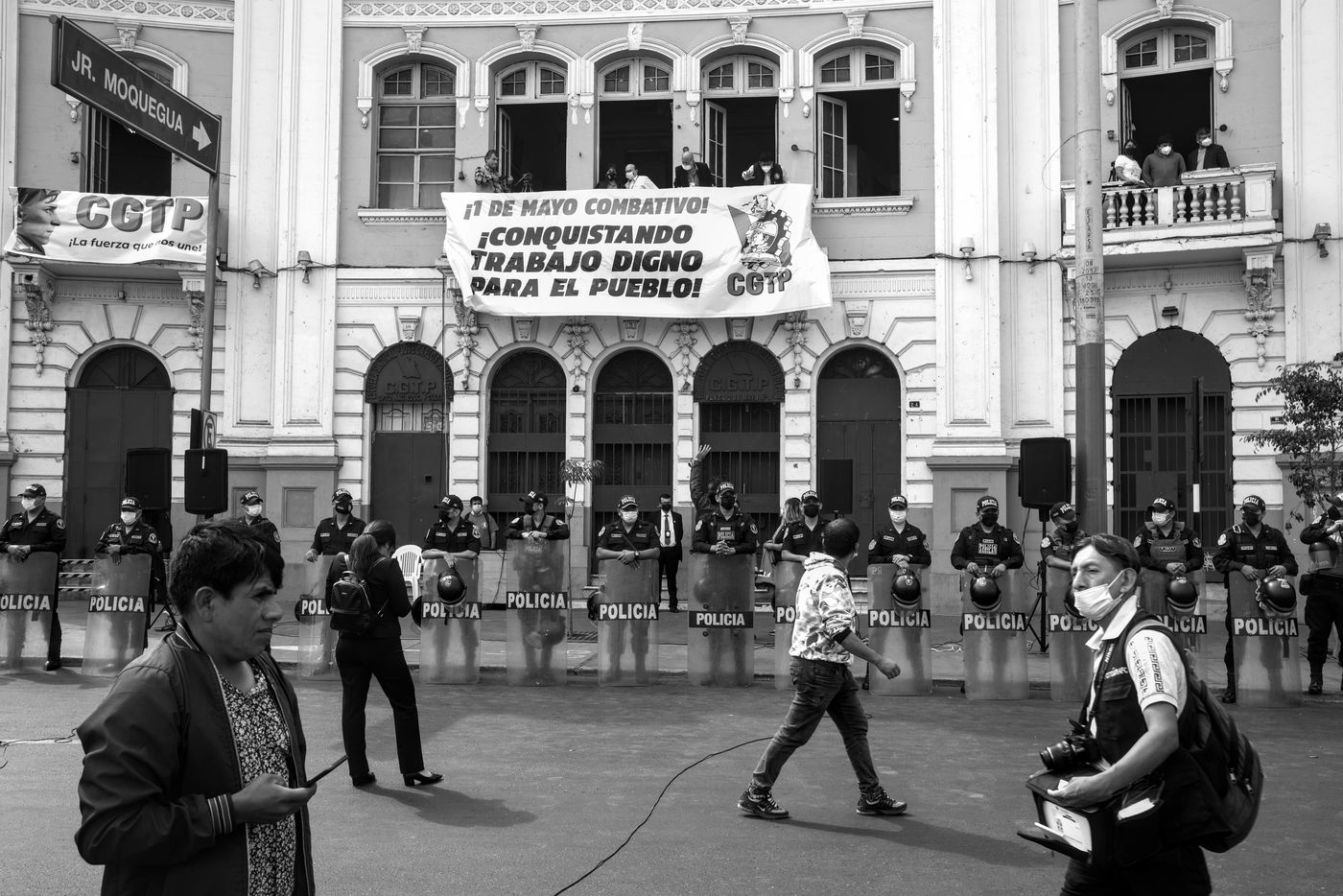 The demonstration of May 1st in Lima was held at the initiative of the CGTP (Confederación General de Trabajadores del Perú). People gathered in the Dos de Mayo square, in front of the CGTP headquarters, from the balcony of which Pedro Castillo, president of the Peruvian Republic, spoke, to the statue of José Carlos Mariátegui, in the 28 de Julio Avenue in the center of Lima. The demands are about the right of work, but also about the call to a constituent assembly, one of the campaign promises of Pedro Castillo. This last one accuses the current constitution which erects the economic liberalism in principle to be responsible for the economic inequalities in Peru.