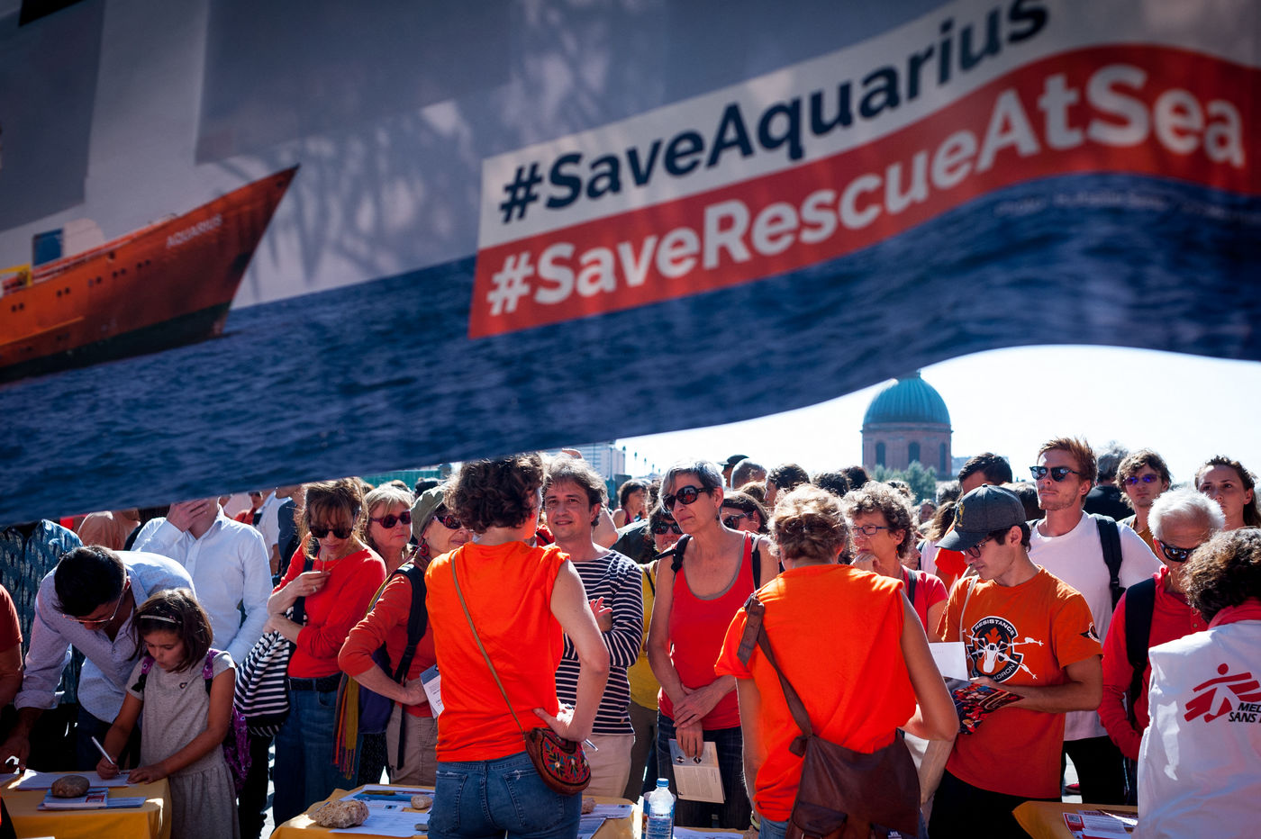 On Saturday, October 6 2018, Place Saint Pierre in Toulouse, more than a thousand people responded to the call of SOS Méditérranée, in support of their ship Aquarius, blocked at the dock in Marseille since October 4. Many wore orange, as a reminder to the hull of the boat.