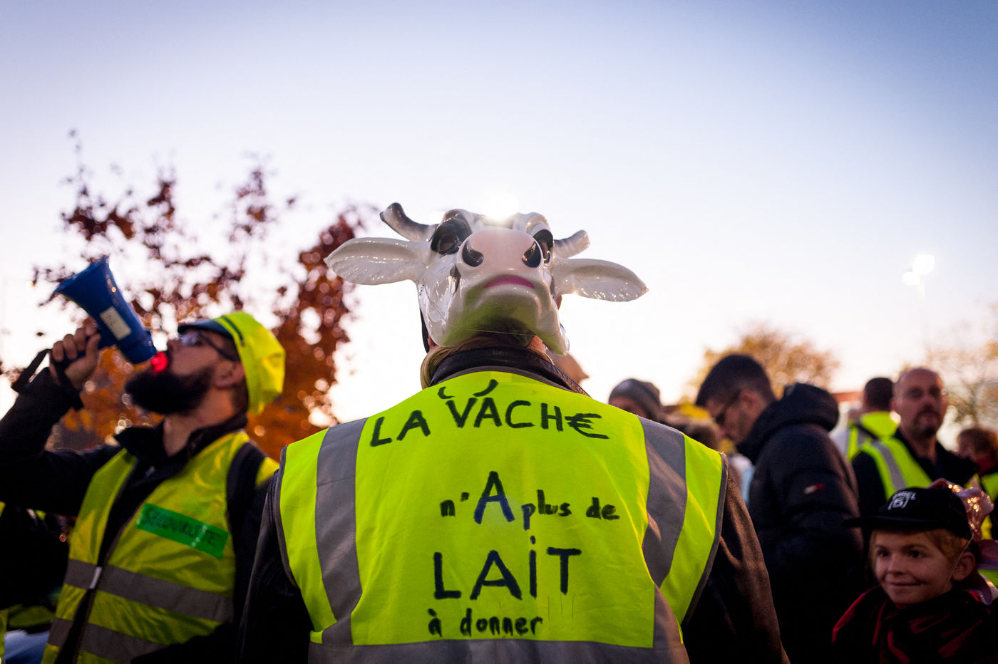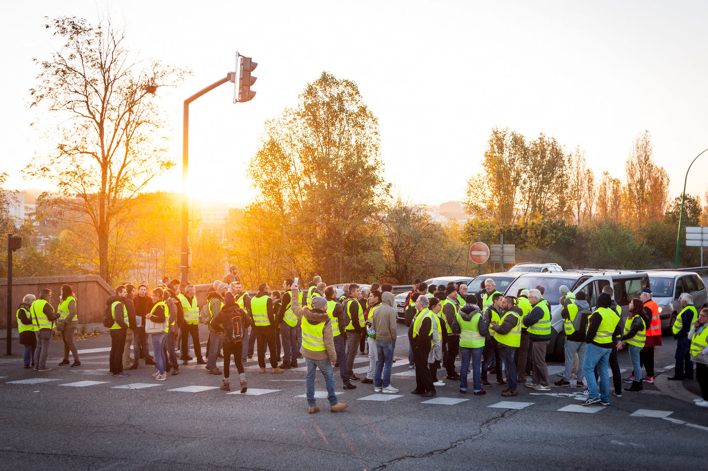 Mouvement des gilets jaunes à Toulouse le 17 novembre 2018 pour protester contre l'augmentation du prix du carburant et plus généralement contre la politique de taxation du gouvernement. Les militants bloquent les accès au périphérique à divers points stratégiques.