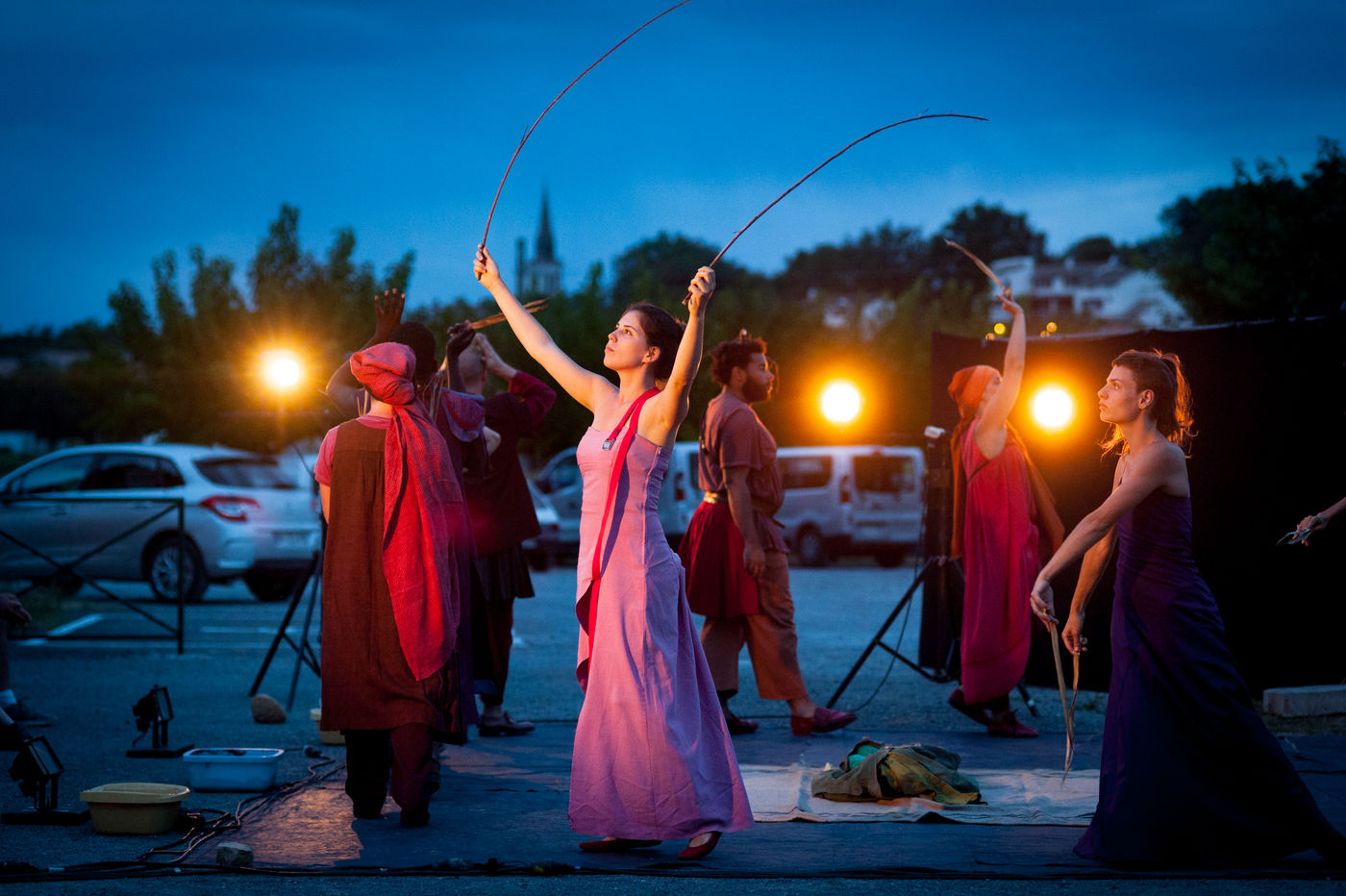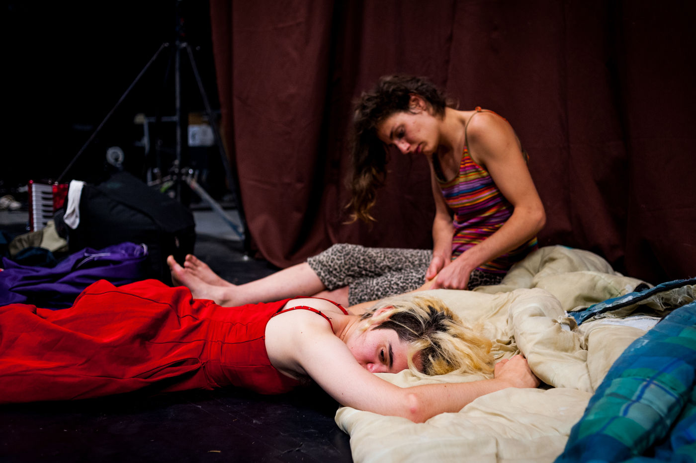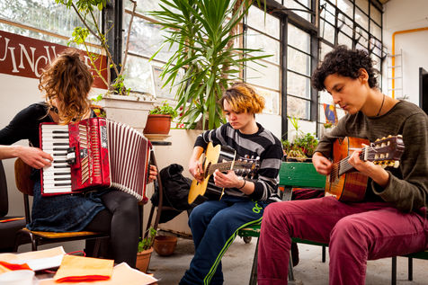 The training provided by the Théâtre du Fil is organized around three axes: continuing education workshops (body, voice, circus, dance, staging, etc.), creative projects (of the show to be performed during the summer tour), and entertainment. In accordance with the principle of mixing populations, the Théâtre du Fil sets up a certain number of partnerships with other structures welcoming people in difficulty: the Institut Médico-Éducatif (IME), the Centre Éducatif Fermé (CEF), prison centres, the Centre d'Accueil pour Demandeurs d'Asile (CADA), children living in so-called "sensitive" districts, etc. It also occasionally welcomes future social workers studying in schools in the Île-de-France region. These times make it possible to create a meeting between the Fil's young trainees and other audiences. The objective is to mix audiences, to provoke the encounter that may not have taken place anywhere else, to grow in contact with the other.