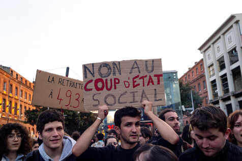Plus de 500 personnes se sont rassemblées à Toulouse le 20 mars, à l'heure du vote de la motion de censure contre le gouvernement d'Emmanuel Macron. La motion a finalement été rejetée, à 9 voix près seulement.