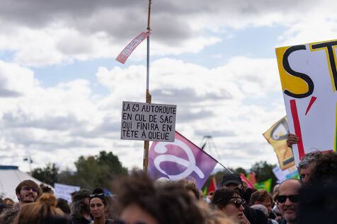 Manifestation Ramdam sur le Macadam, le 21 octobre 2023 pour protester contre le controversé projet de l'A69 devant reliant Castres à Toulouse. Organisé par de nombreux collectifs, le rassemblement a réuni environ 10 000 personnes, selon les organisateurs.