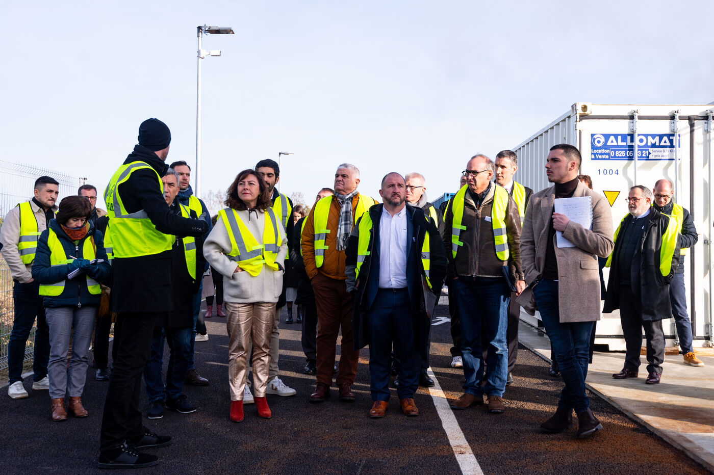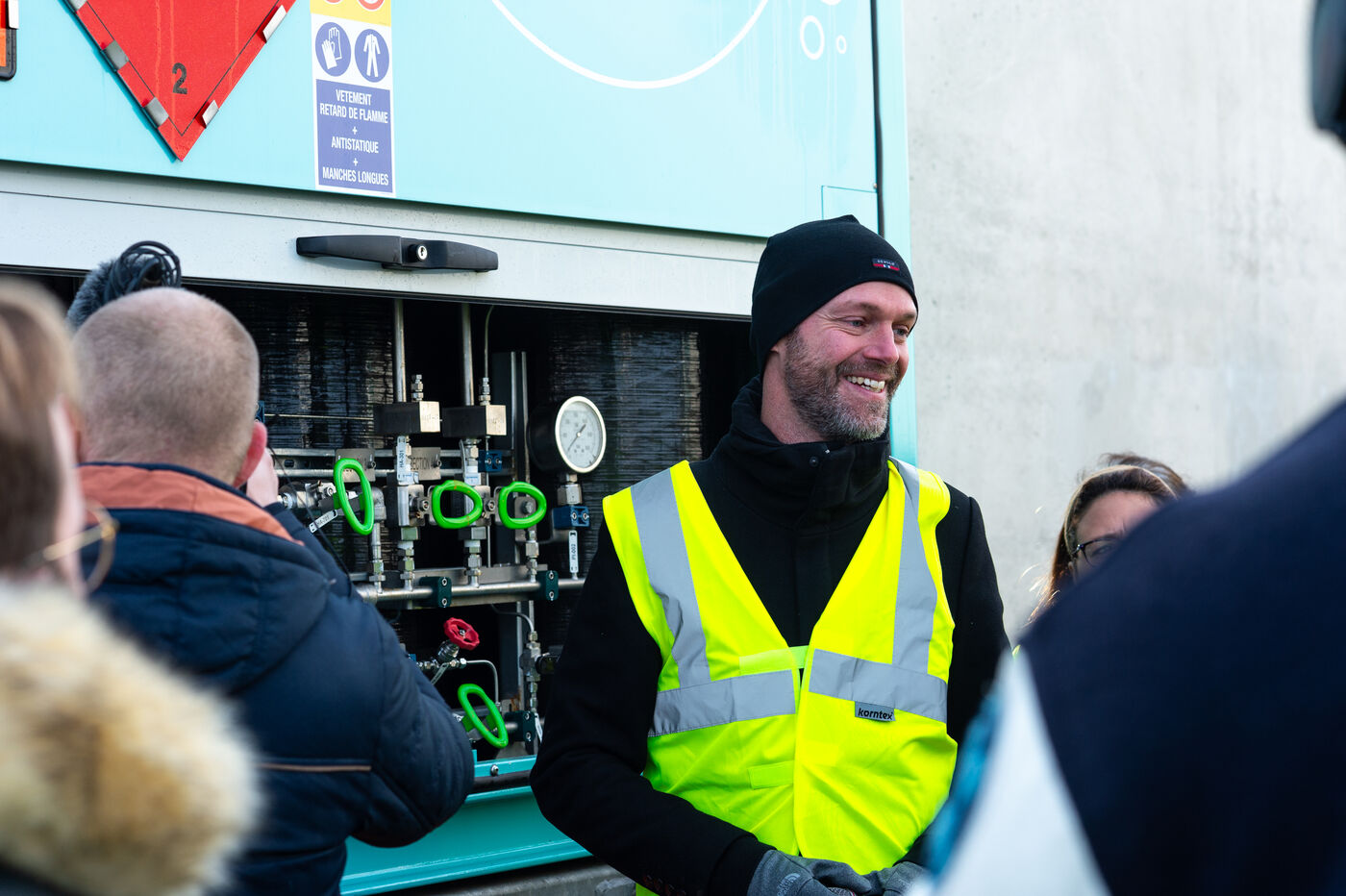 Inauguration du nouveau site de production d'hydrogène renouvelable de Lhyfe à Bessières le 7 décembre 2023 en présence notamment du maire de Bessieres et de Carole Delga, Présidente de Région Occitanie. L'entreprise leader en Europe produit de l'hydrogène vert, c'est à dire issu de l'électrolyse de l'eau et d'une source d'énergie renouvelable, sur la terre ferme ou off-shore, et s'occupe de l'approvisionnement par conteneur ou pipeline.