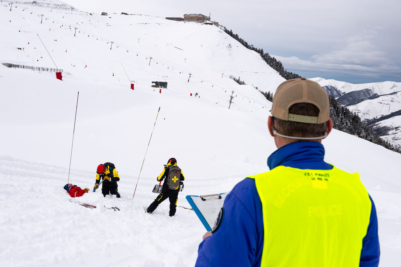 The CRS Pyrénées led the exercise, in coordination with the Luchon high-mountain gendarmerie unit and the SAMU, as well as the resort's ski patrols. The exercise involved a simulated avalanche, with skiers involved.