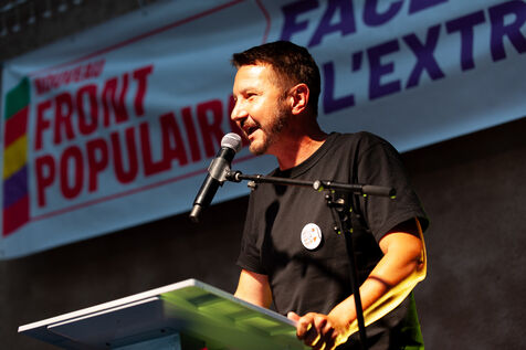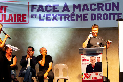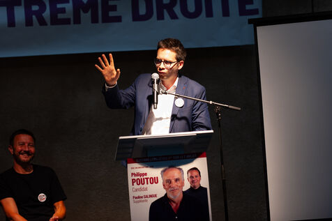 Philippe Poutou's campaign meeting in Carcassonne on July 4, 2024, with his deputy Pauline Salingue, as well as Olivier Besancenot and Hadrien Clouet. Philippe Poutou is running in the Aude department's first constituency against outgoing RN member of parliament Christophe Barthès.