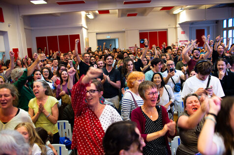 Soirée électorale du Nouveau Front Populaire au second tour des élections législatives déclenchées par la dissolution de l'assemblée nationale par Emmanuel Macron. Une soirée de liesse générale après l'annonce des résultats donnant le Nouveau Front Populaire grand gagnant de cette dissolution.