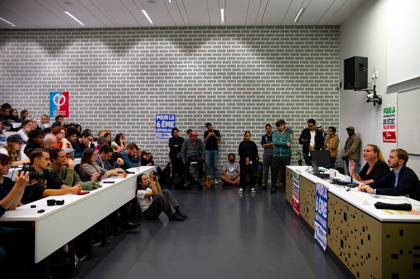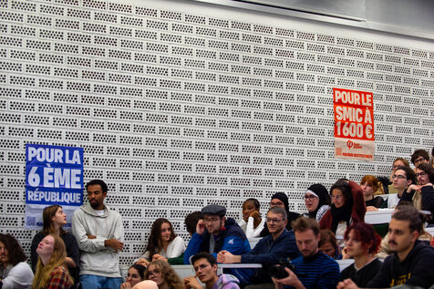 Mathilde Panot's conference at Mirail University on October 17, 2024. La France Insoumise members of parliament François Piquemal, Christophe Bex, Anne Stambach-Terrenoir and Hadrien Clouet were present, in a packed amphitheater.