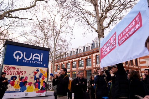 Six cent personnes se sont rassemblées à Toulouse devant le Quai des Savoirs le 7 mars 2025 en soutien au mouvement état-unien Stand up for Science, pour protester contre les attaques contre la communauté scientifique, la recherche et les droits civiques en cours aux États-Unis de Trump.