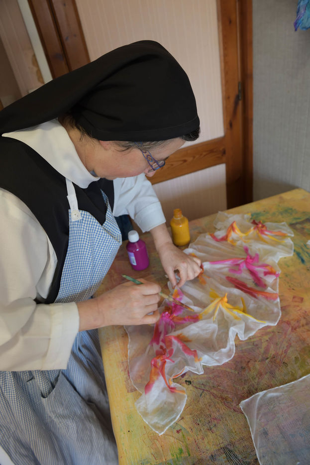 The community of Sainte-Marie du Rivet Abbey brings together fourteen Trappistine nuns of different origins and, for some, of different nationalities. Faithful to the rule of Saint Benoit "prayer and work", they pray seven times a day with a first office at 4:30 am (Vigils, early morning office) and work for monastic craftsmanship of recognized quality. Thus, since manual labor is fundamental in Cistercian spirituality and monasteries live from their small businesses, a task is assigned to each nun of the abbey. Some nuns make biscuits (cakes, shortbread, macaroons) others santons, candles and painted silk scarves.