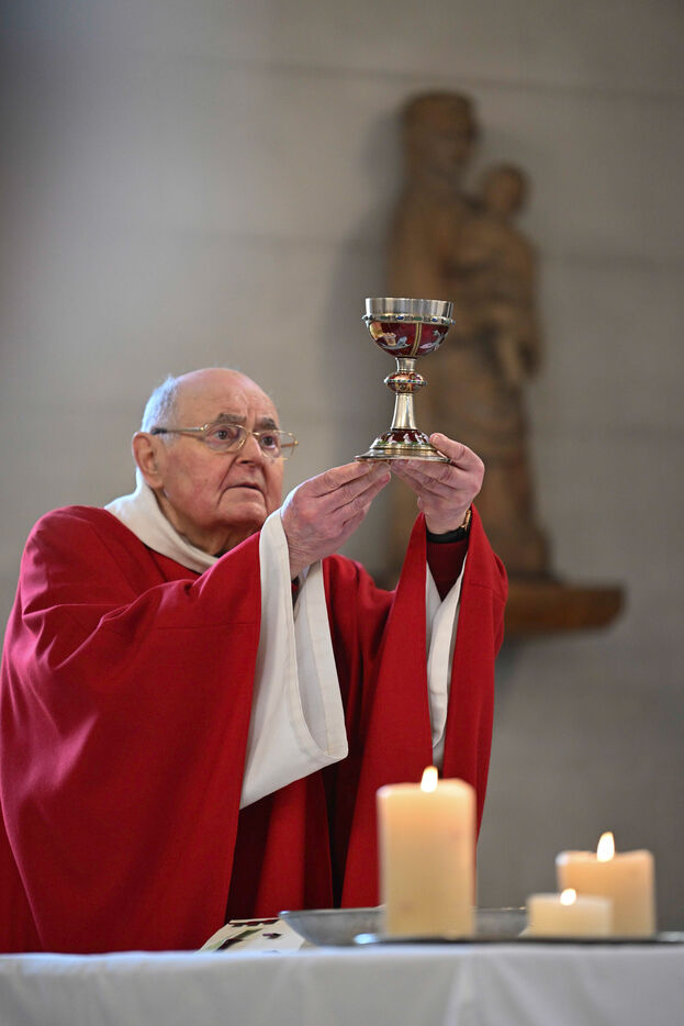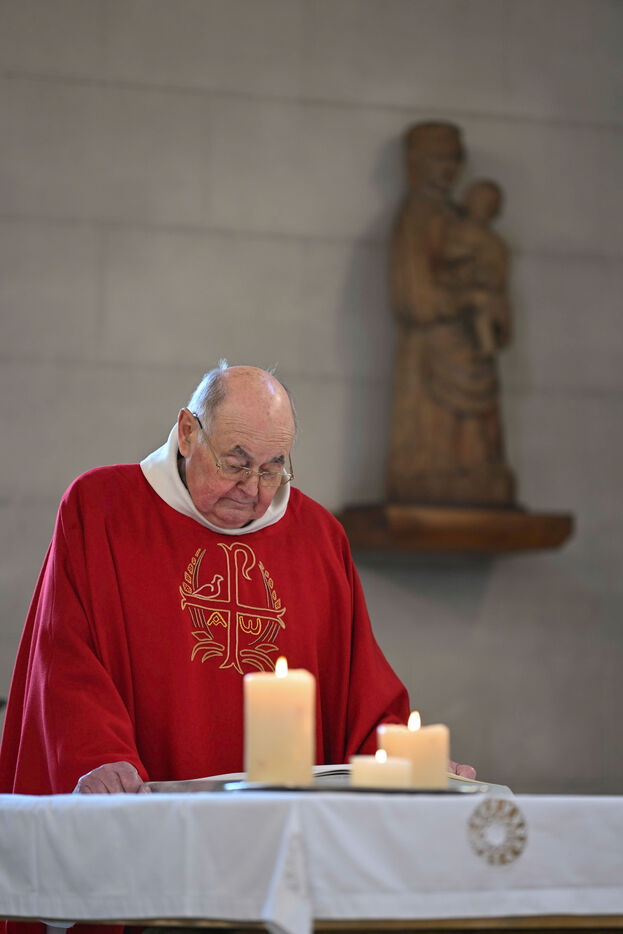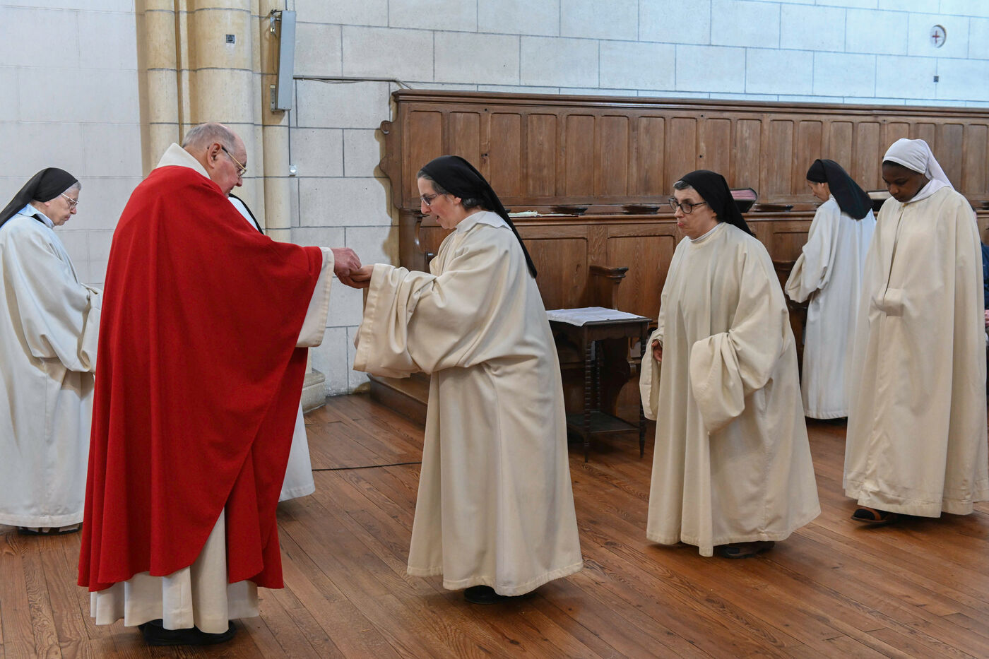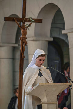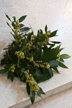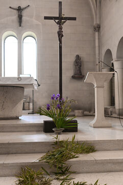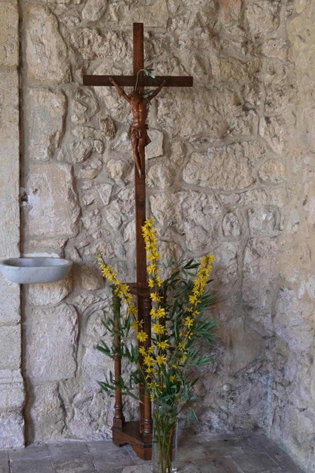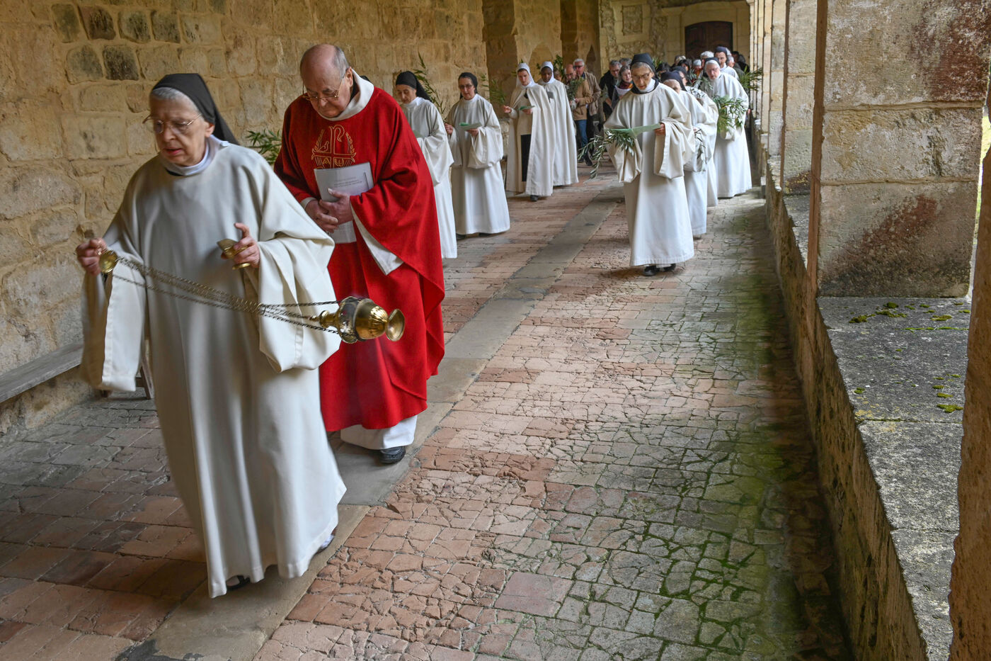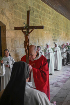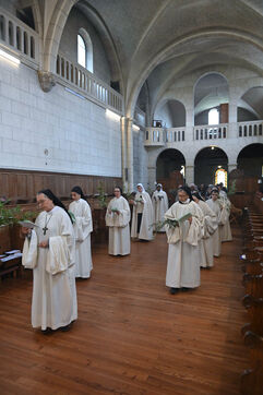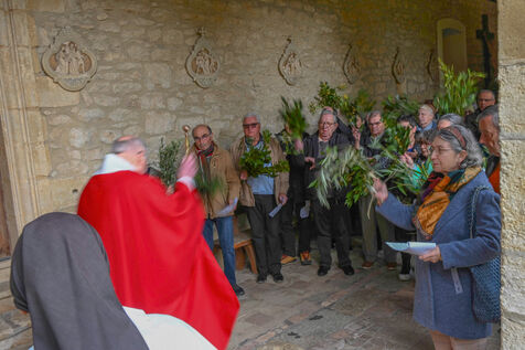 At the Abbey of Sainte Marie du Rivet in Auros, in the Gironde department as in the entire Christian community Palm Sunday celebrates the arrival of Jesus in Jerusalem and also marks the beginning of Holy Week six days before Easter. At the beginning of this celebration the nuns of the abbey and the faithful associated with the service enter the church with branches of boxwood, olive or laurel blessed by the priest officiating at the abbey dressed in a red chasuble symbolizing the love passion and blood shed by Christ. The branches symbolize the palm branches that people placed on Christ's path during his entry into Jerusalem to greet and acclaim him.