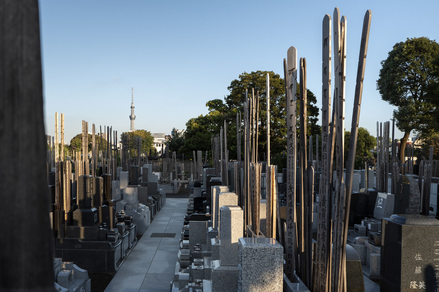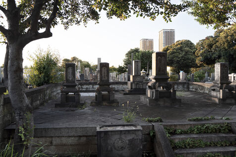 Cemeteries in Japan are often located near residential areas or temples. The repetitive geometry of the alignments of cut stone steles, sometimes in the shape of a lantern, is reminiscent of the geometry of the city in the background.