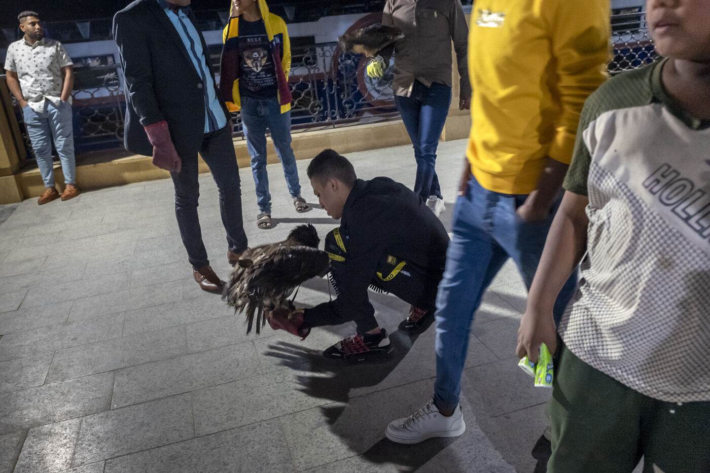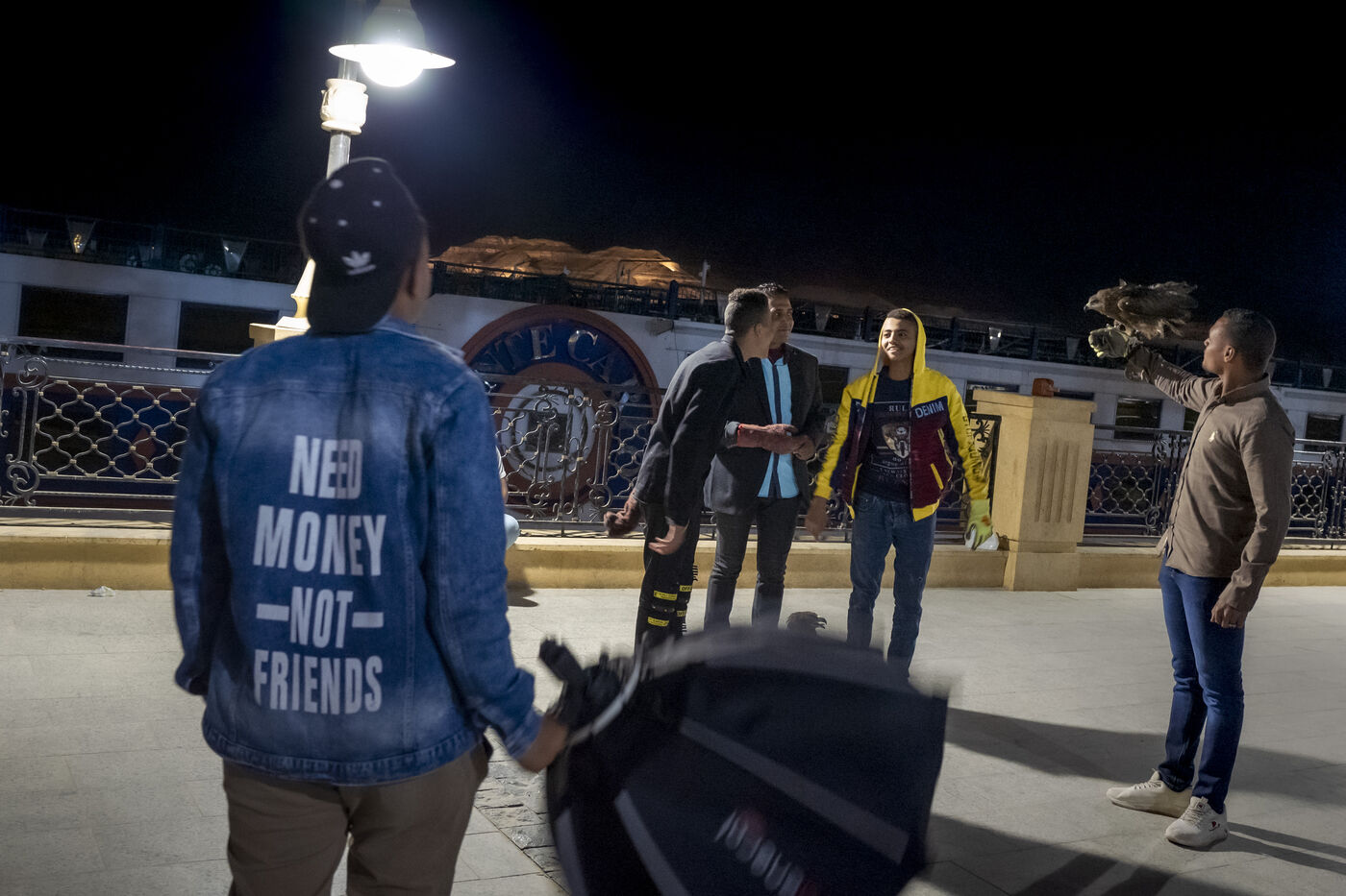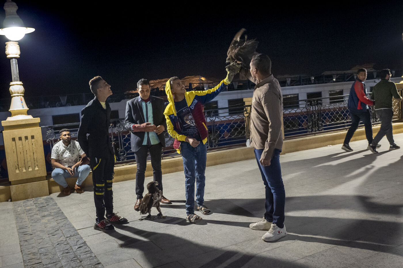 Des vendeurs sont à la recherche de touristes pour prendre une photo avec leur faucon, le soir sur la promenade le long du Nil à Louxor. Ils représentent eux-mêmes une attraction pour les habitants sortis prendre l’air frais du soir.