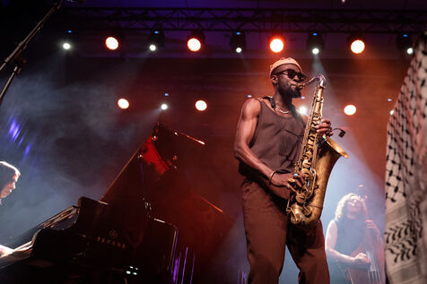 Le compositeur et saxophoniste Isaiah Collier, basé à Chicago, en concert au Montreux Jazz Festival 2025 avec le groupe The Chosen Few, comprenant Liya Grigoryan (pno), Emma Dayhuff (bass) et Tim Regis (drms).