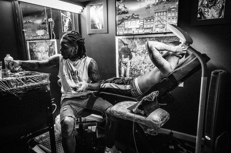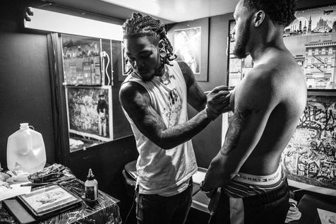 Tatoueur en pleine création dans son studio du Bronx à New York.