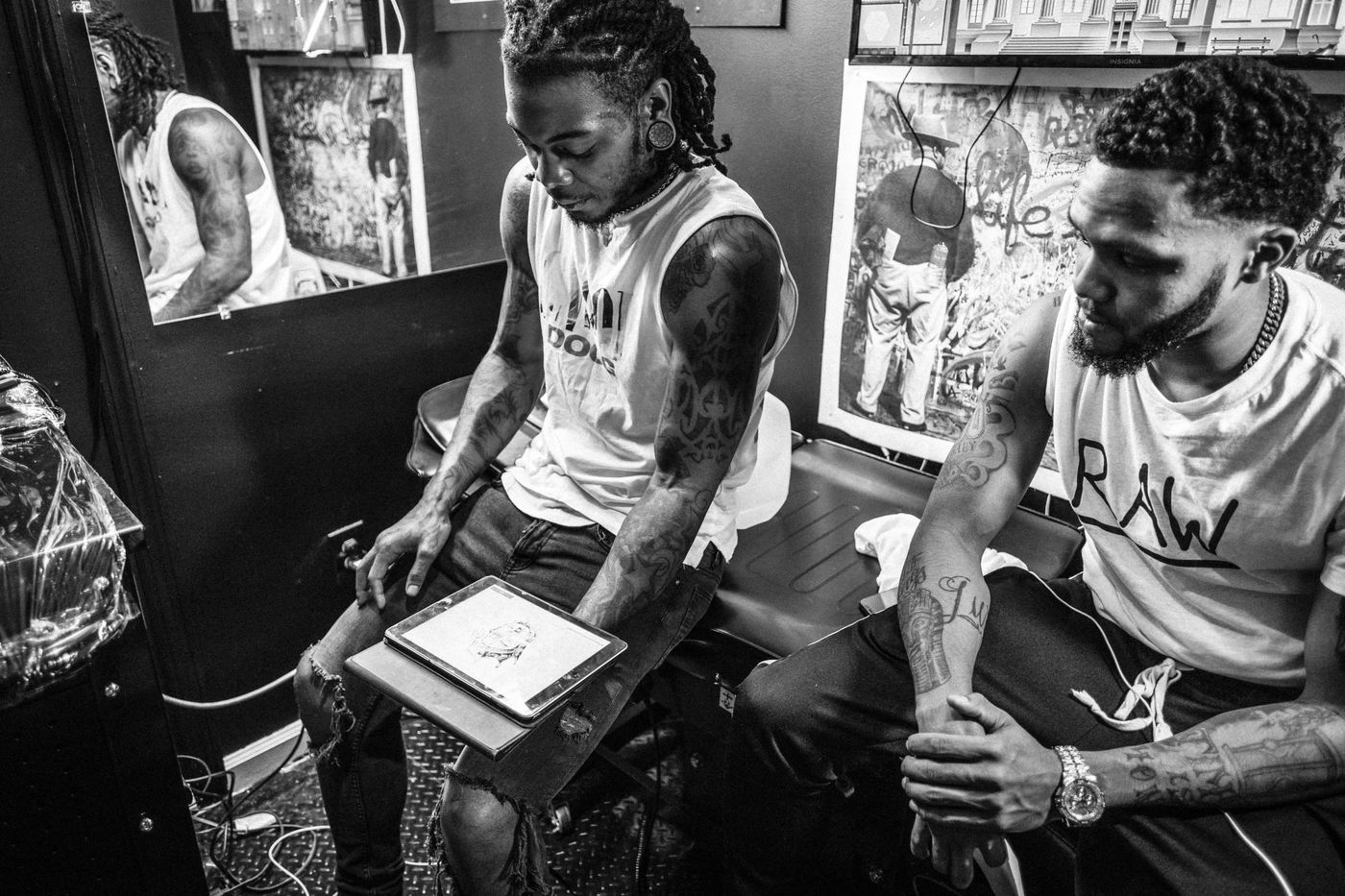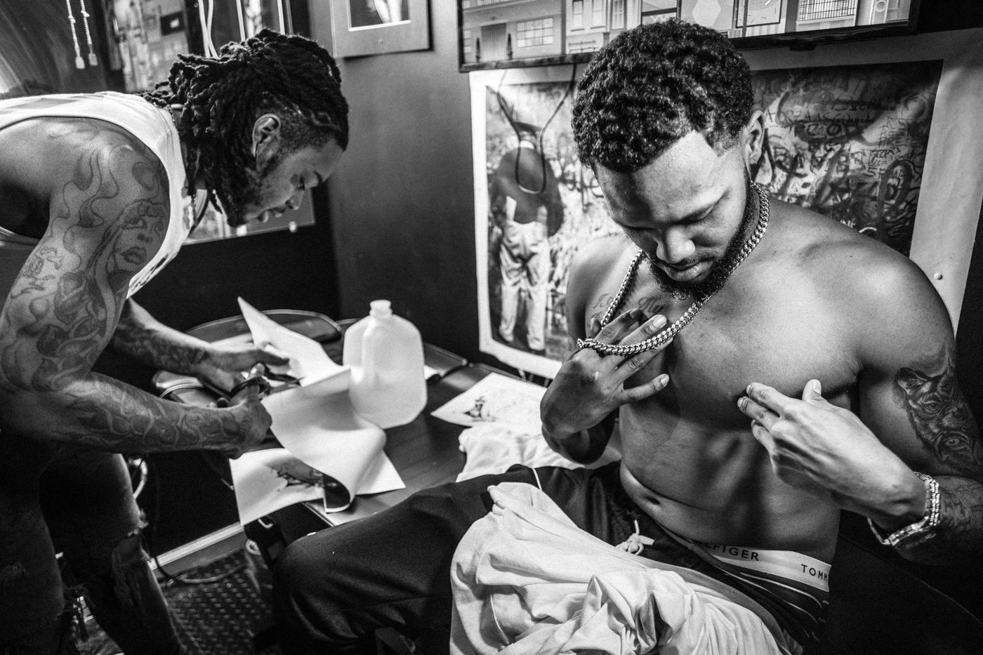 Tattoo artist at work in his studio in The Bronx, New York.
