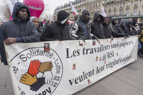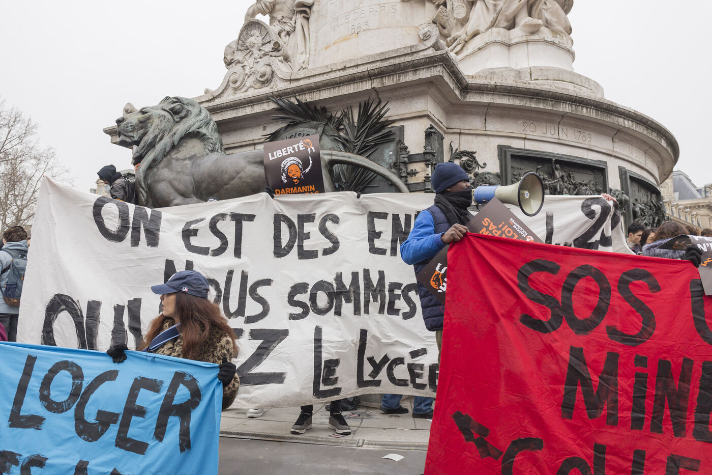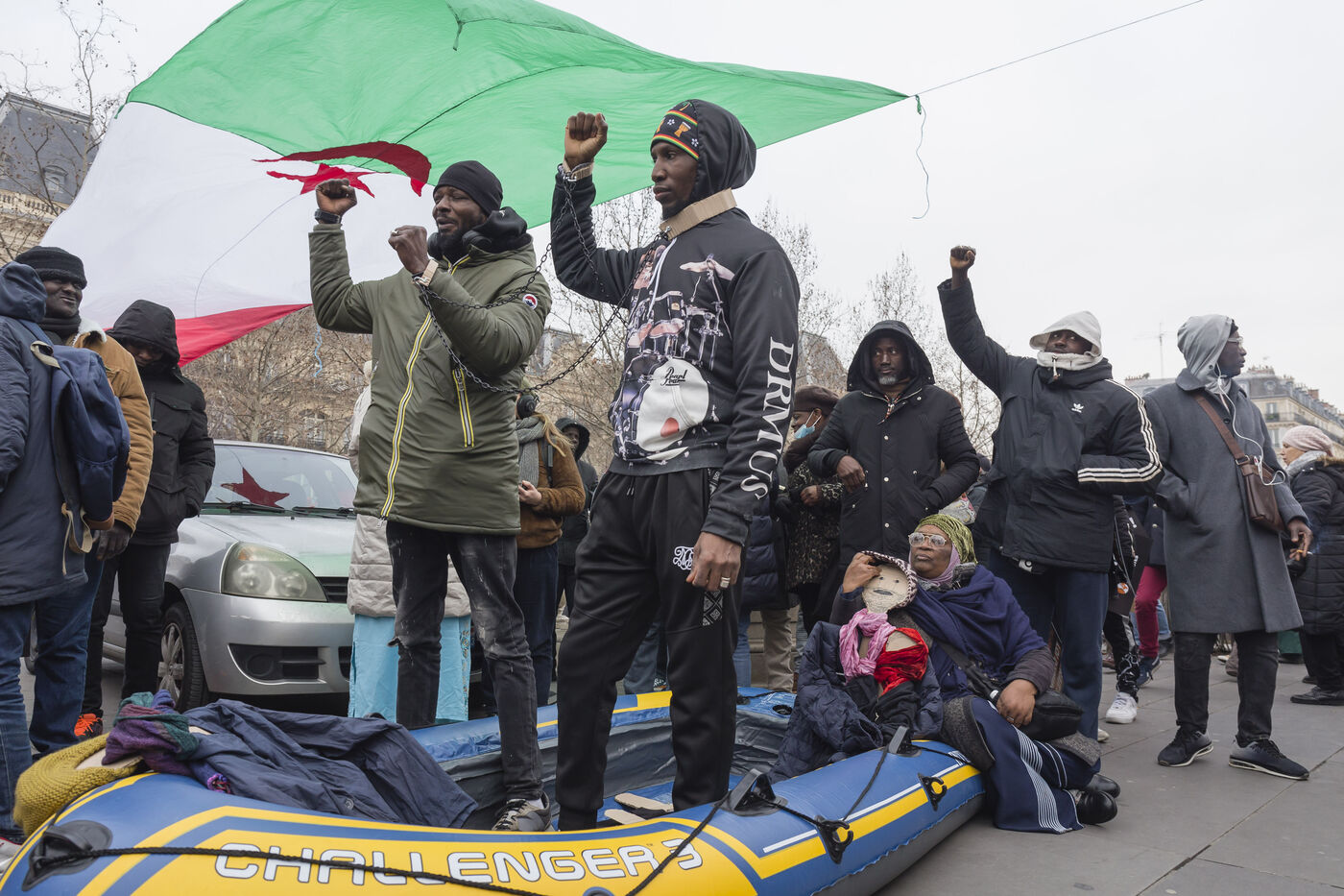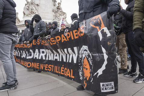 France, Paris, 2024-01-14. Rally at Place de la République in Paris following the call for mobilisation throughout France to withdraw the Immigration Act currently being examined by the Constitutional Council, which is due to give its ruling on 25 January. Photograph by Pascal SONNET / Hans Lucas.