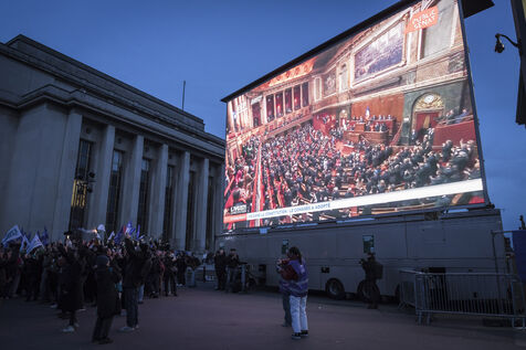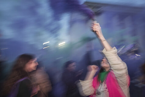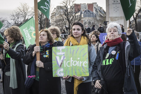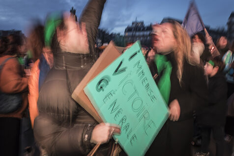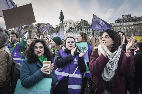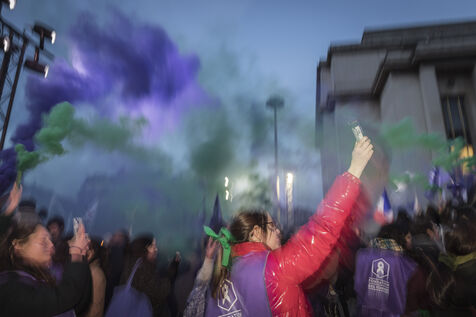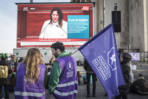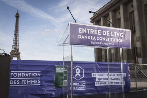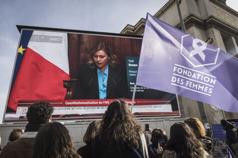 France, Paris, 2024-03-04. Rally at Place du Trocadéro in Paris for the live broadcast of the parliamentary vote to enshrine voluntary interruption of pregnancy (IVG) in the Constitution. Photograph by Pascal SONNET / Hans Lucas.