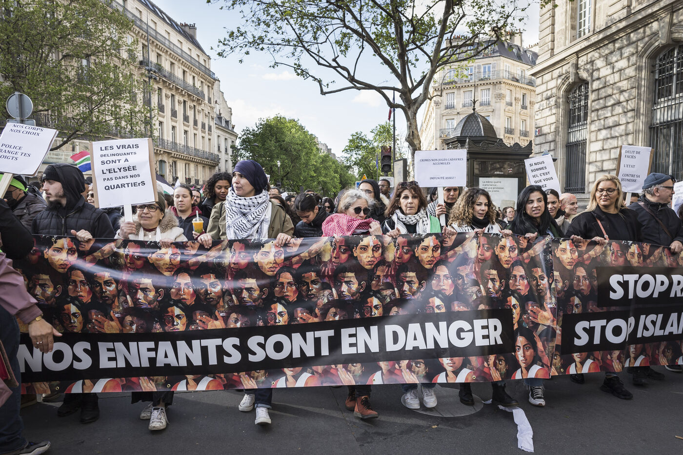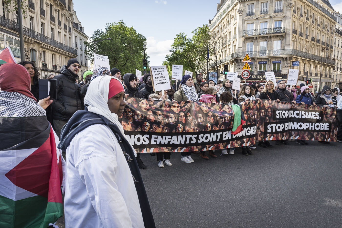 France, Paris, 2024-04-21. The April 21 march in Paris against racism, Islamophobia and for the protection of all children, started at Barbés and ended at Place de la République. Photograph by Pascal Sonnet / Hans Lucas.
