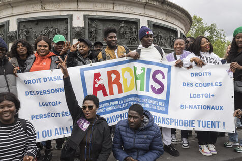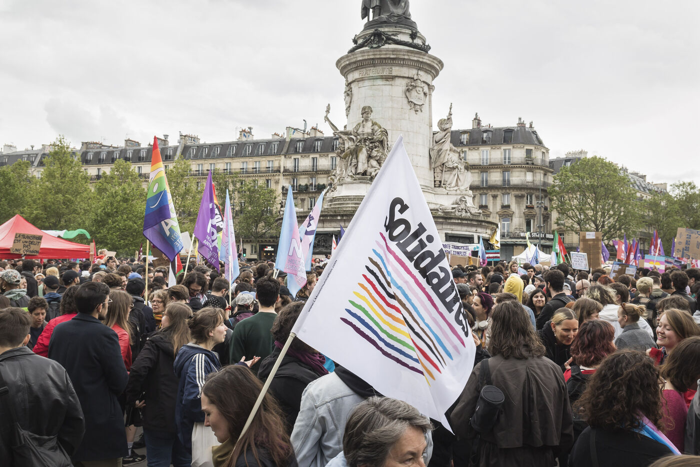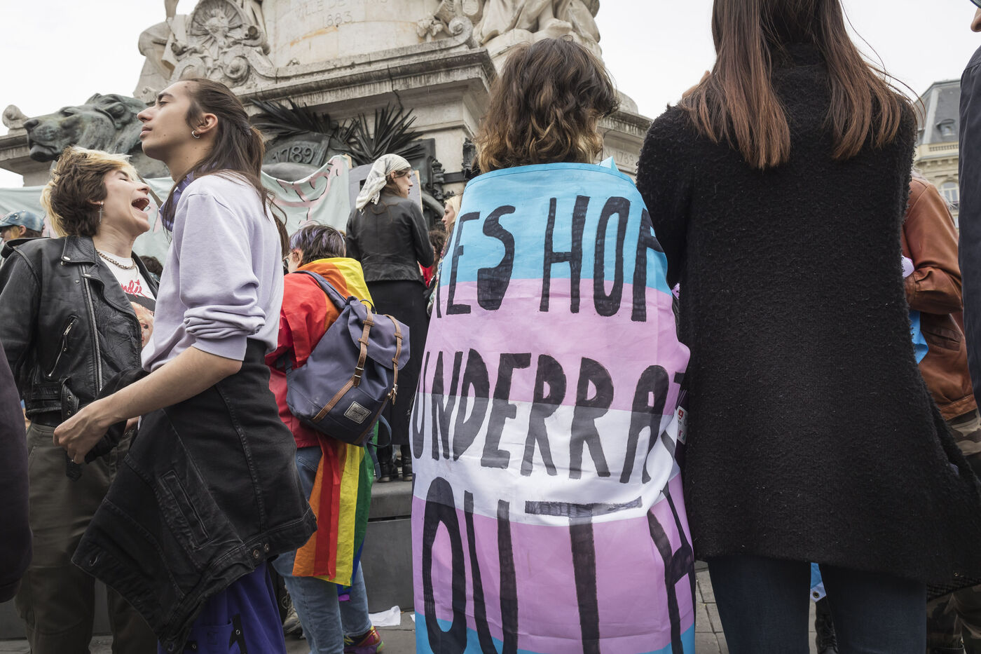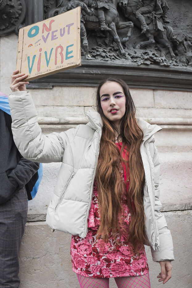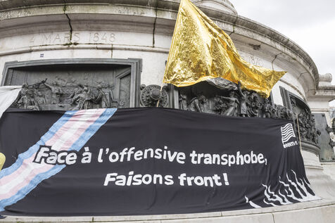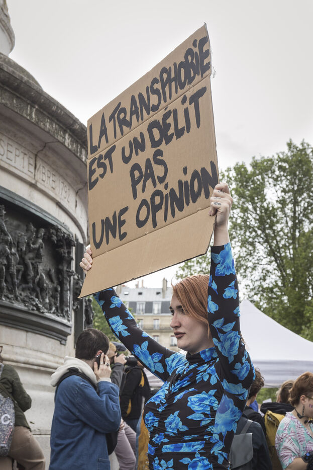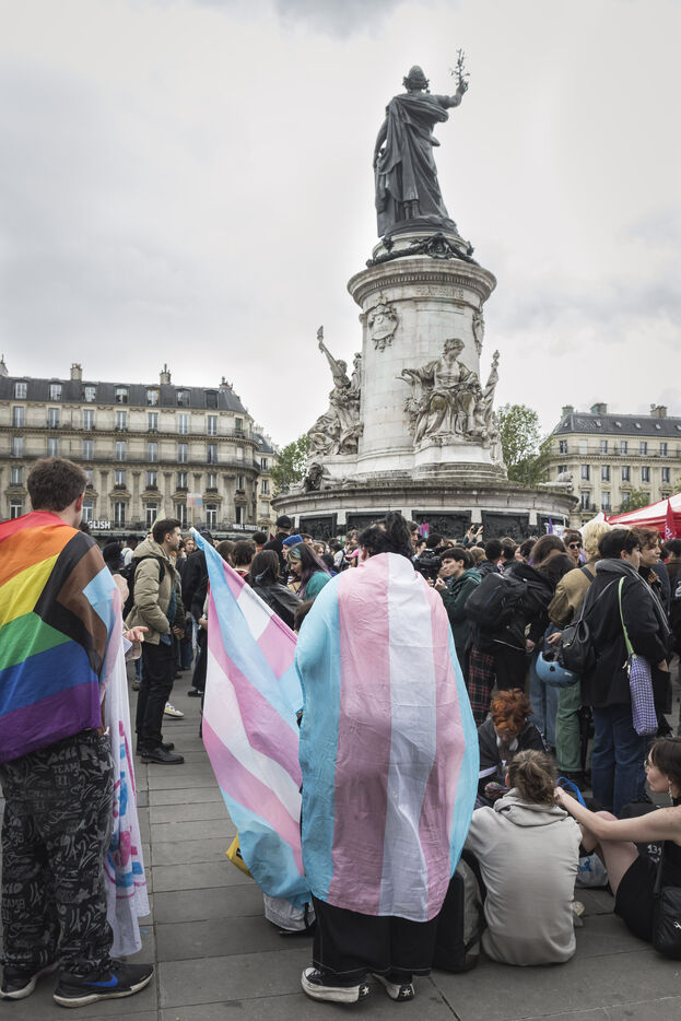 France, Paris, 2024-05-05. The demonstration at Place de la République in Paris on 5 May, called by the LGBTQI+ community to defend the rights of transgender people and the right to control their own bodies. Photograph by Pascal SONNET / Hans Lucas.